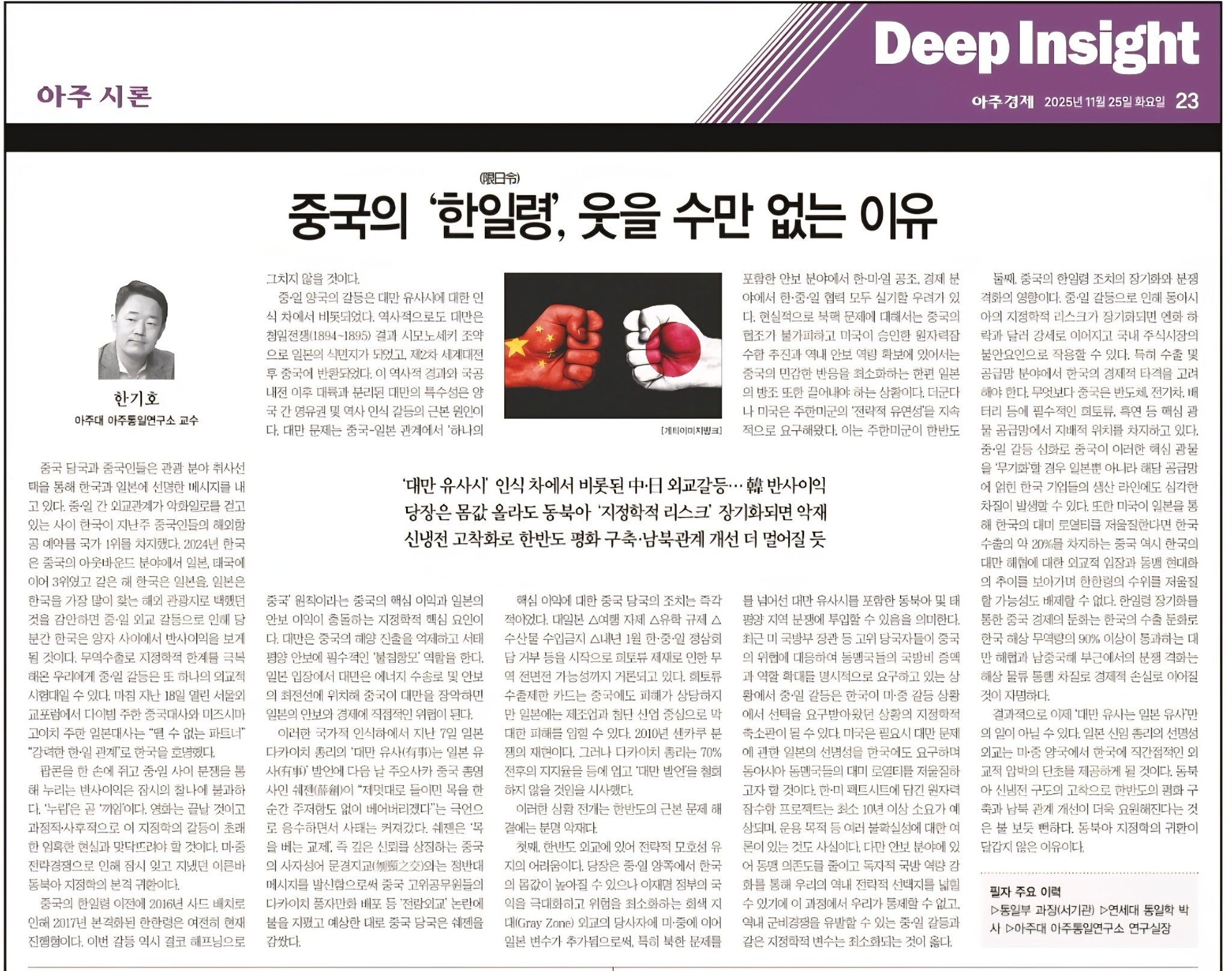 20251125 [교수칼럼][한기호 칼럼] 중국의 '한일령'(限日令), 웃을 수 없는 이유