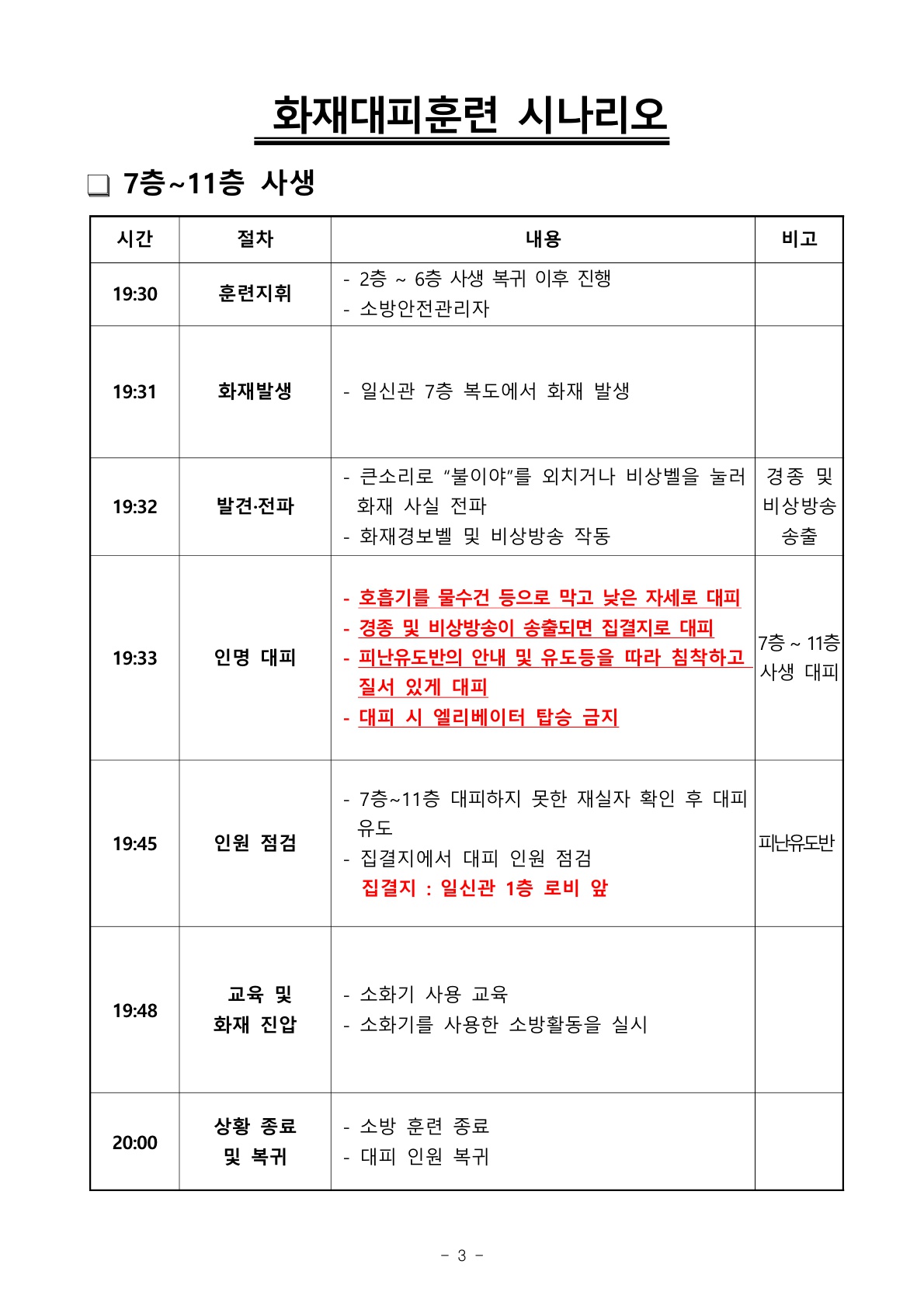 1) 일신관 사생은 하단의 [화재대피훈련 시나리오 및 대피요령]을 숙지바랍니다.