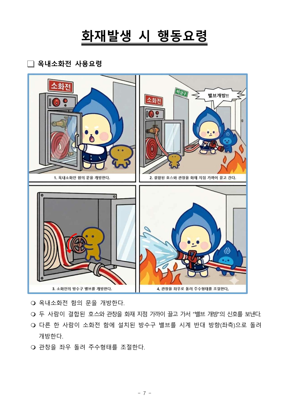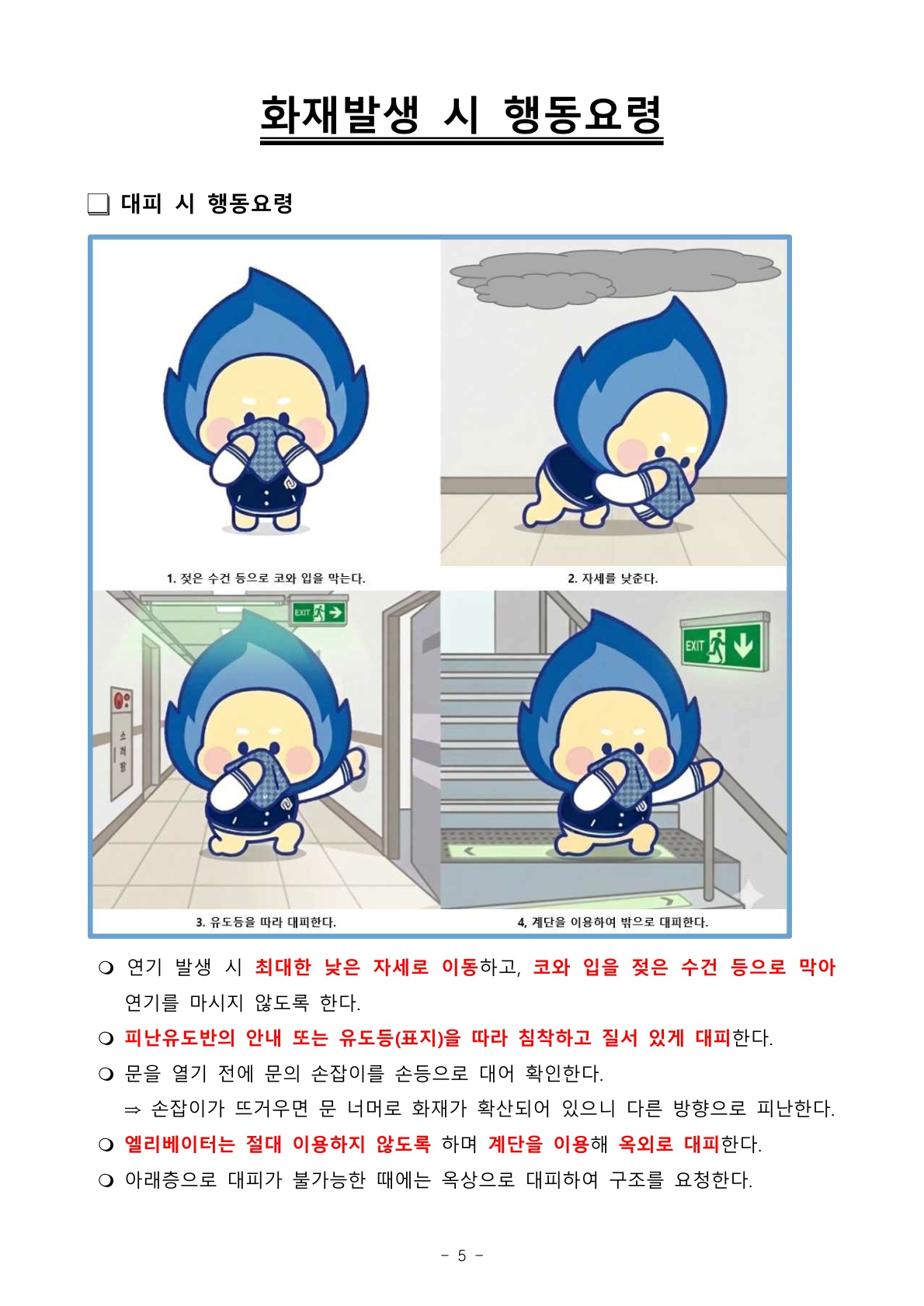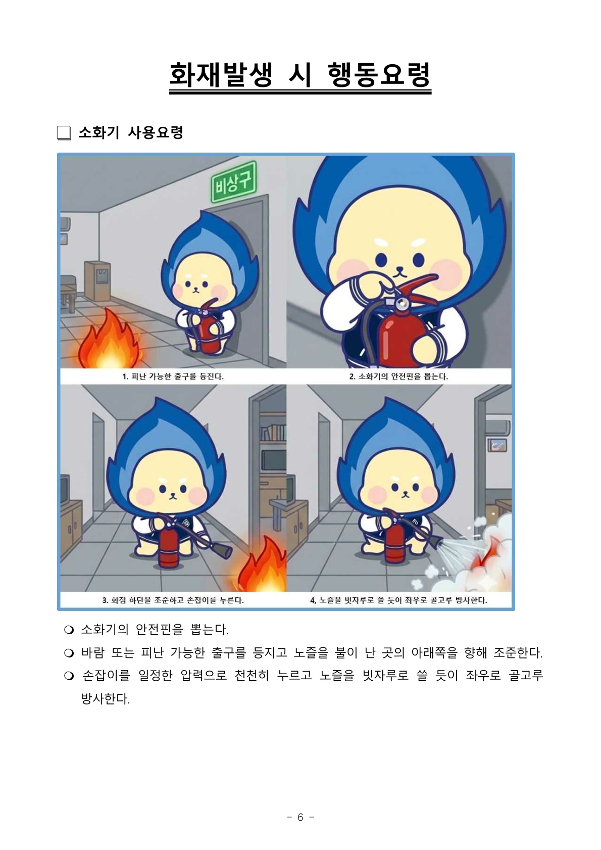 5. 훈련 및 교육 내용: 경종 및 비상방송에 따라 대피 후 소화기 사용법 등 교육 및 훈련 진행