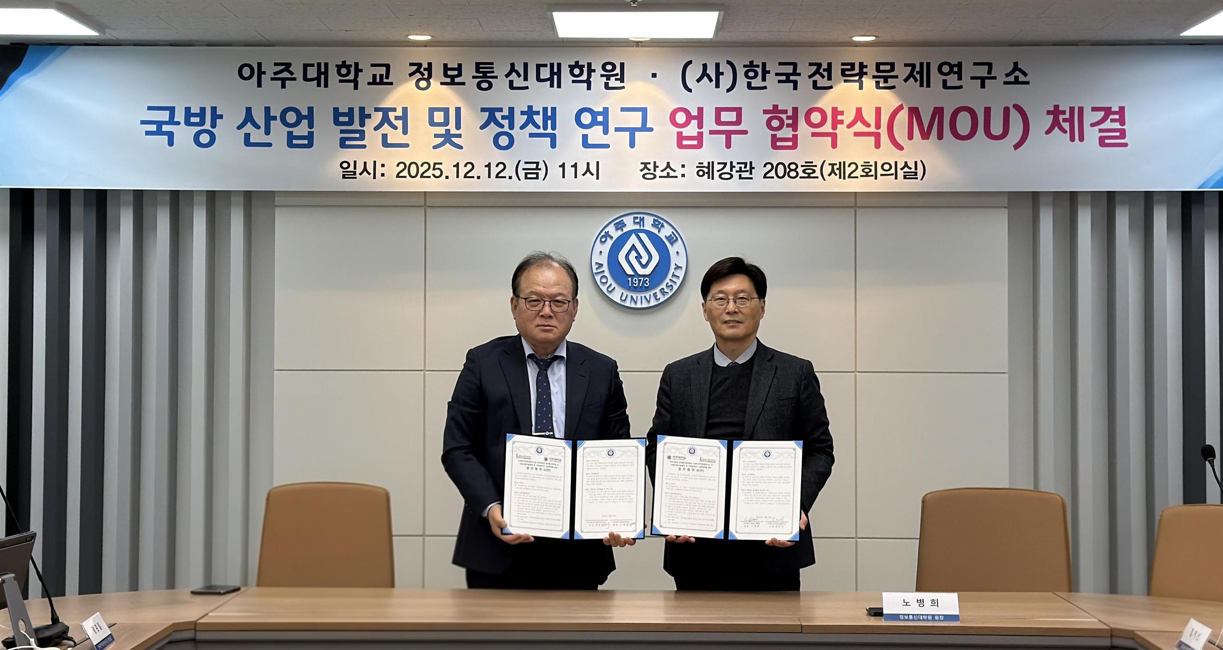 아주대학교 정보통신대학원이 한국전략문제연구소와 국방 산업 발전 및 국방 정책 연구 교류를 위한 양해각서(MOU)를 체결했다.