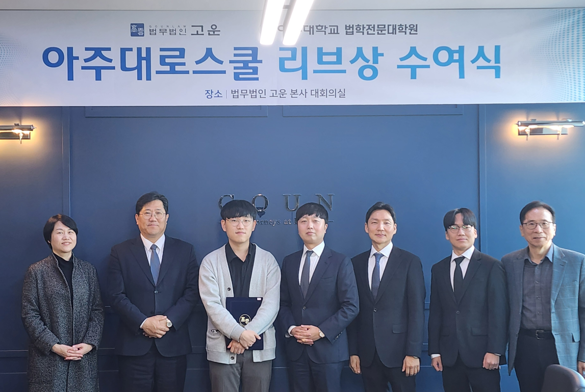 법무법인 고운 리걸브레인상(Legal Brain) 수여식이 2025년 11월 11일 열렸다. 이날 행사에는 법학전문대학원 소병천 원장, 곽희경 학생부원장, 수상자 대표 문승연 원생이 참석했고, 법무법인 고운에서는 조철현 대표변호사, 이경렬 부대표변호사, 최진안 파트너 변호사(前 아주대 법학전문대학원 교수), 정광진 변호사가 참석했다.