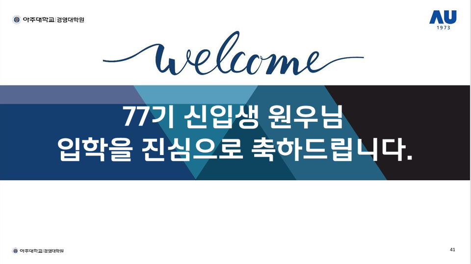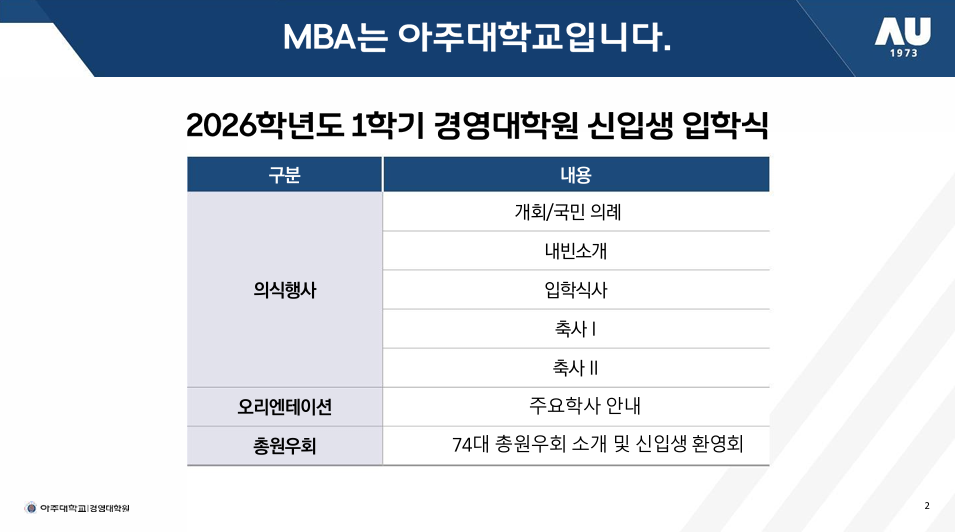 2026학년도 경영대학원 석사77기 입학식이 다산관 강당에서 신입생 124명, 총원우회장 및 재학생, 총동문회장 및 많은 동문들과 함께 축하의 자리를 함께 하였습니다. 부푼 꿈을 안고 교정에 첫발을 내디딘 77기 신입생의 눈빛에는 배움에 대한 뜨거운 열정과 새로운 도전을 향한 의지가 가득했으며, 그 모습을 지켜보는 이들의 마음까지 따뜻하게 느낄 수 있습니다. 입학식 이후, 74대 총원우회 주관 신입생 환영회에서는 77기의 뜨거운 열정을 느낄 수 있었습니다.