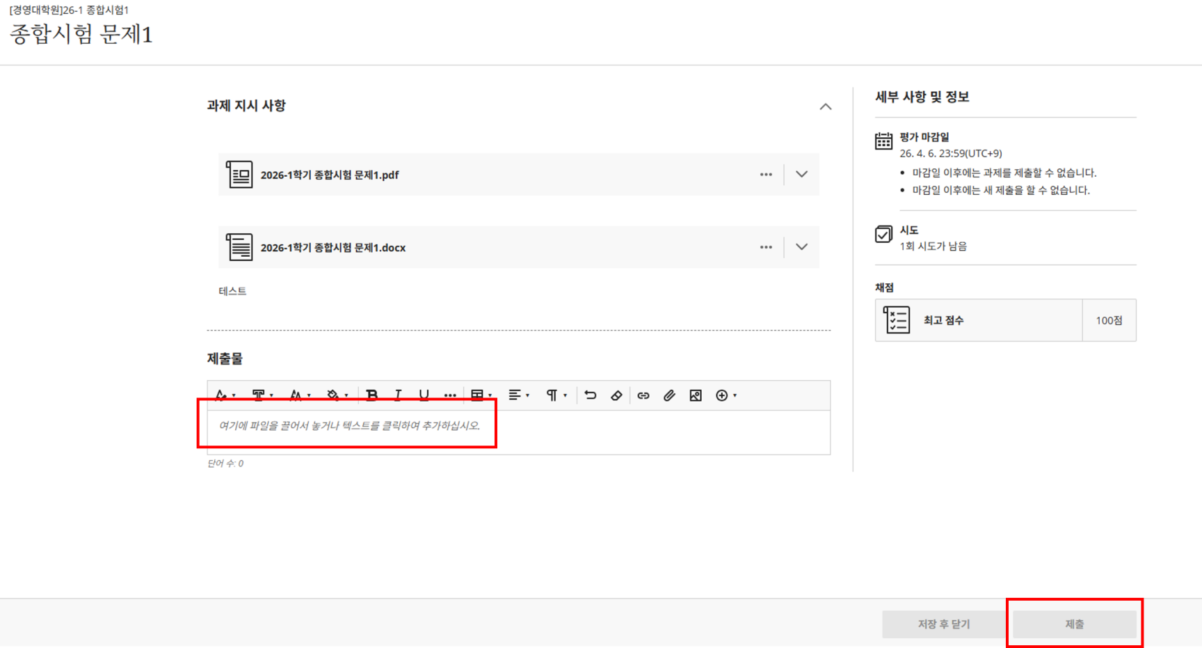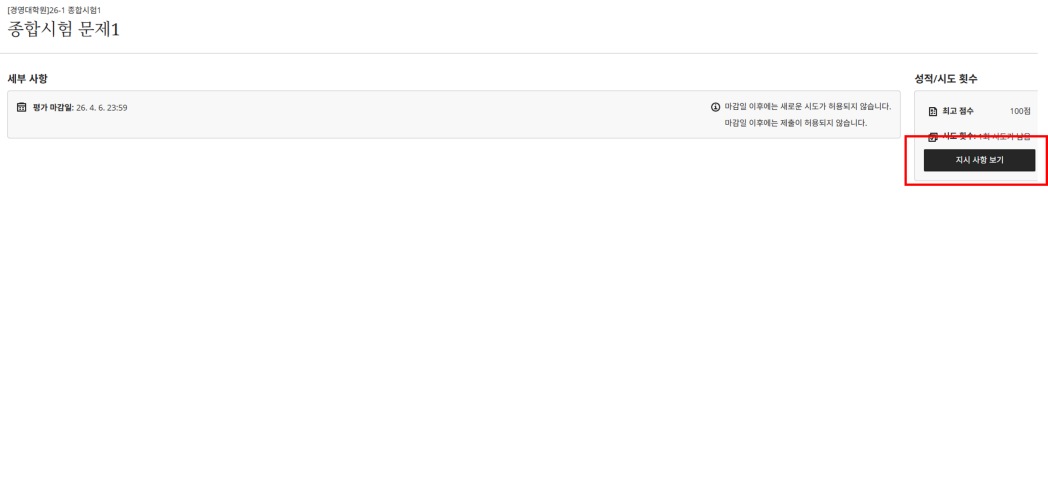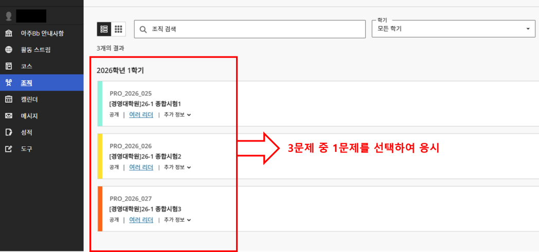 아주대학교 포탈 로그인 -> 아주Bb -> 조직 -> [경영대학원]26-1 종합시험 클릭 -> 3문제 중 1문제 선택 -> 지시사항 보기 -> 답안 업로드 -> 제출(응시기간 내 1회에 한하여 답안 업로드 가능)