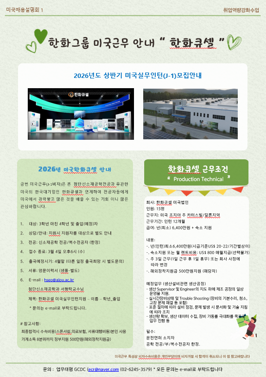 한화큐셀 미국 인턴십 공채 추천 및 설명회 개최와 관련하여 아래와 같이 안내드립니다.
