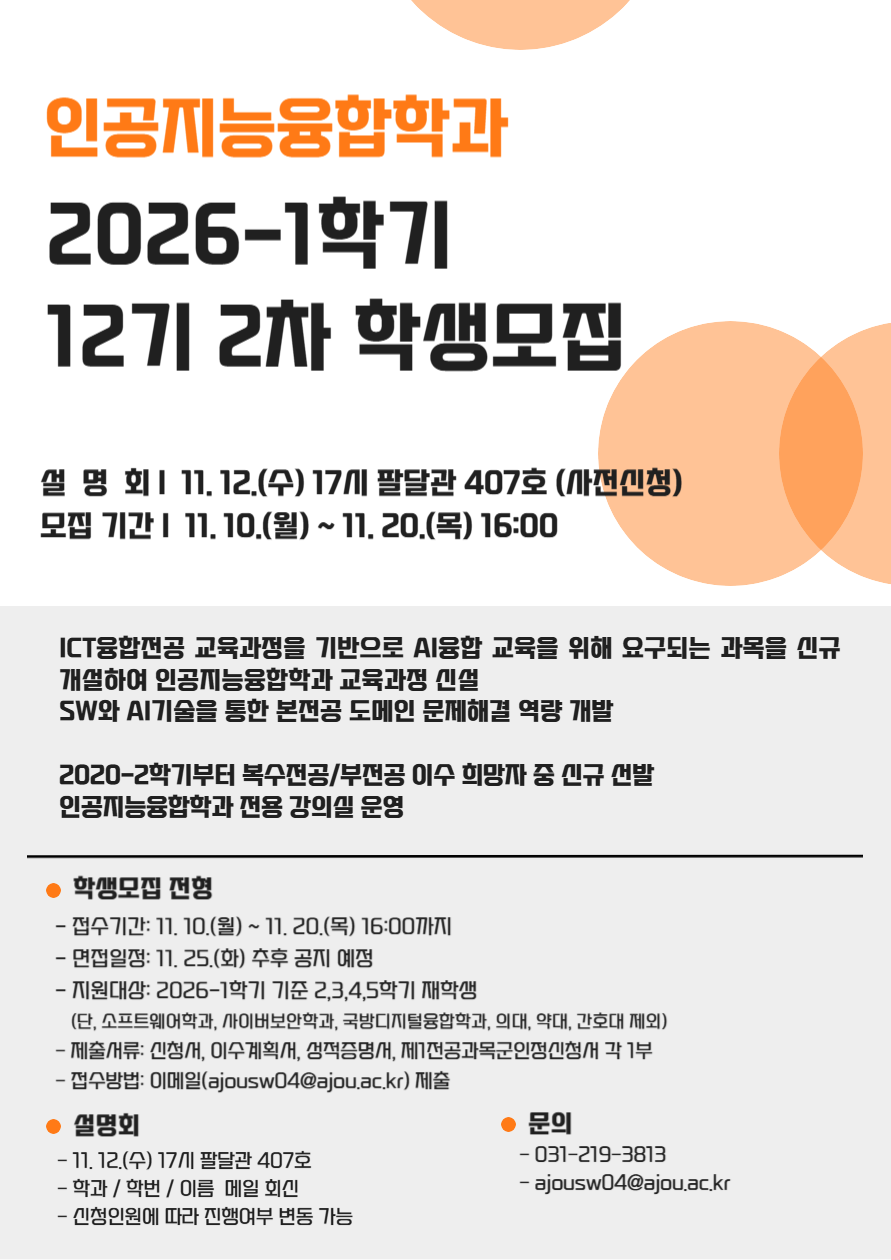 ▣ 설명회: 2025년 11월 12일(수) 17시 팔달관 407호 [과목 등 학과 설명 및 Q&A 진행 예정] - 사전 신청: 학과/학번/이름 작성하여 메일 접수(ajousw04@ajou.ac.kr)