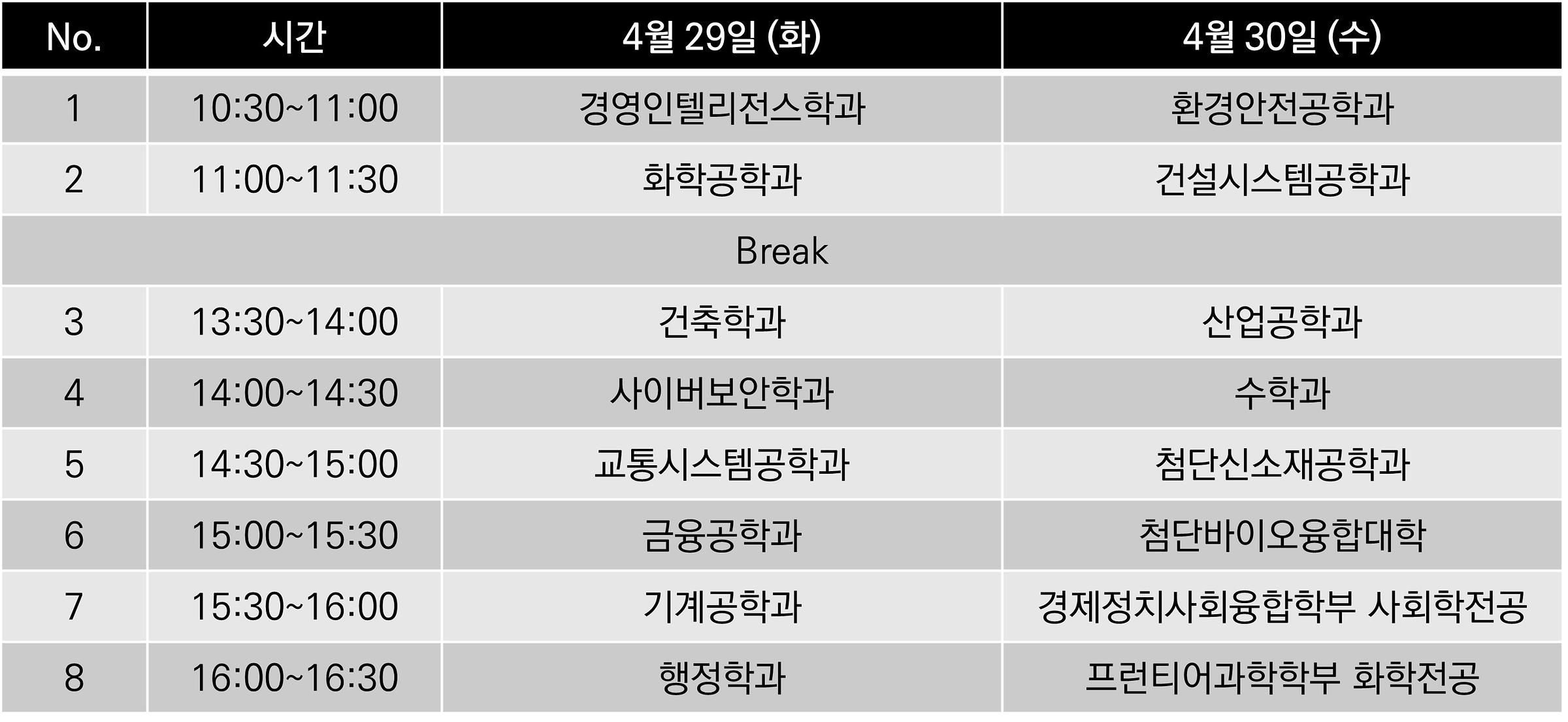 전공 설명회는 박람회의 세부 프로그램 중 하나로, 학과의 교수님께서 직접 학과 전공 및 진로, 대학원 진학 등에 대해 소개해주시는 시간입니다.