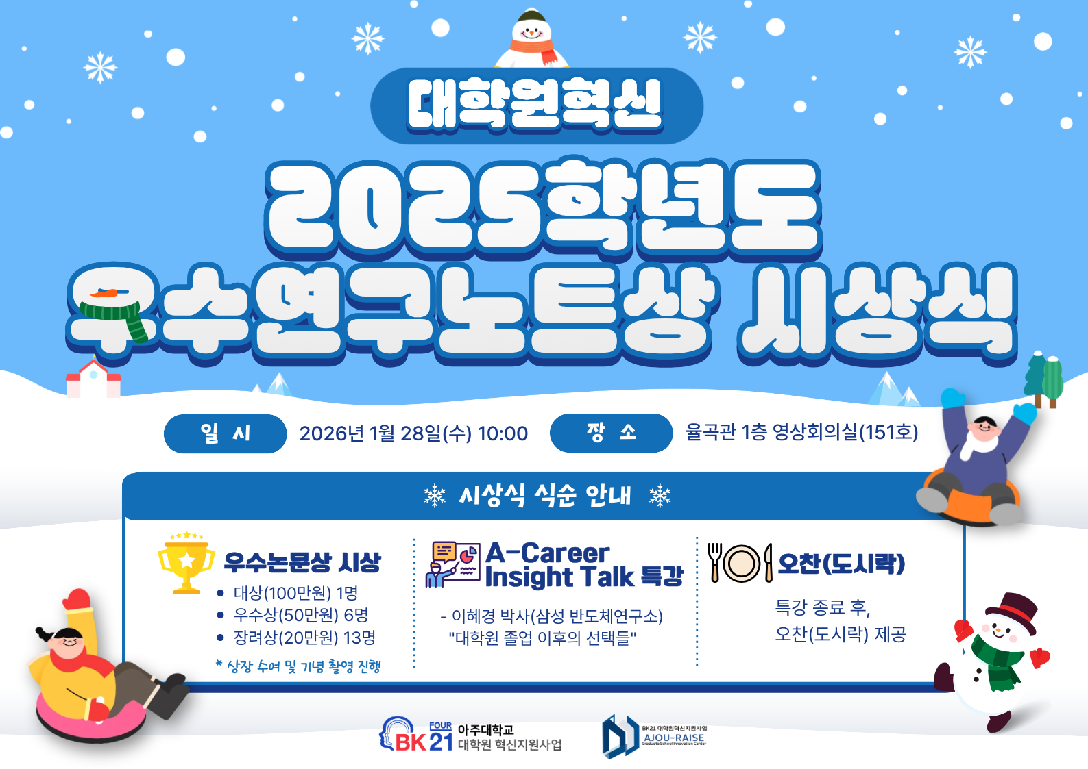 대학원혁신지원사업에서 2025학년도 우수논문 및 우수연구노트상 시상식을 아래와 같이 개최하오니 많은 관심과 참여 부탁드립니다.