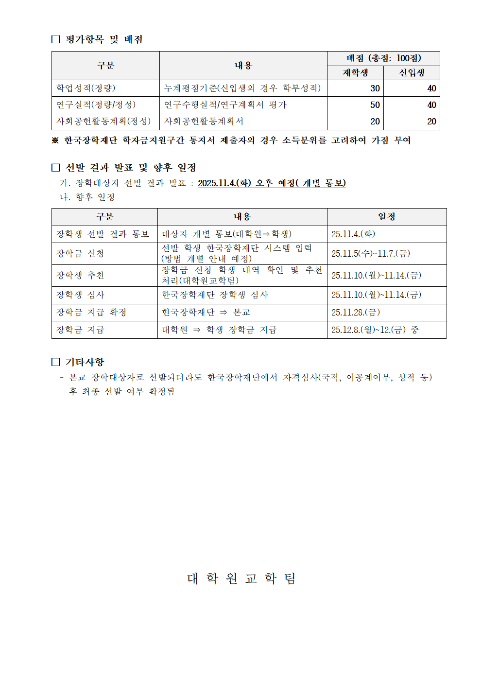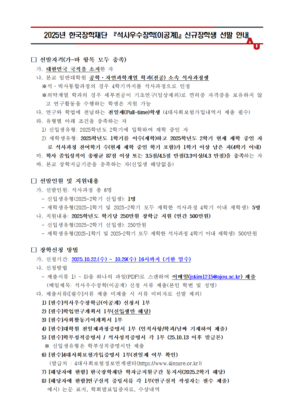 2025년 한국장학재단 [석사우수장학(이공계)] 신규장학생 선발안내