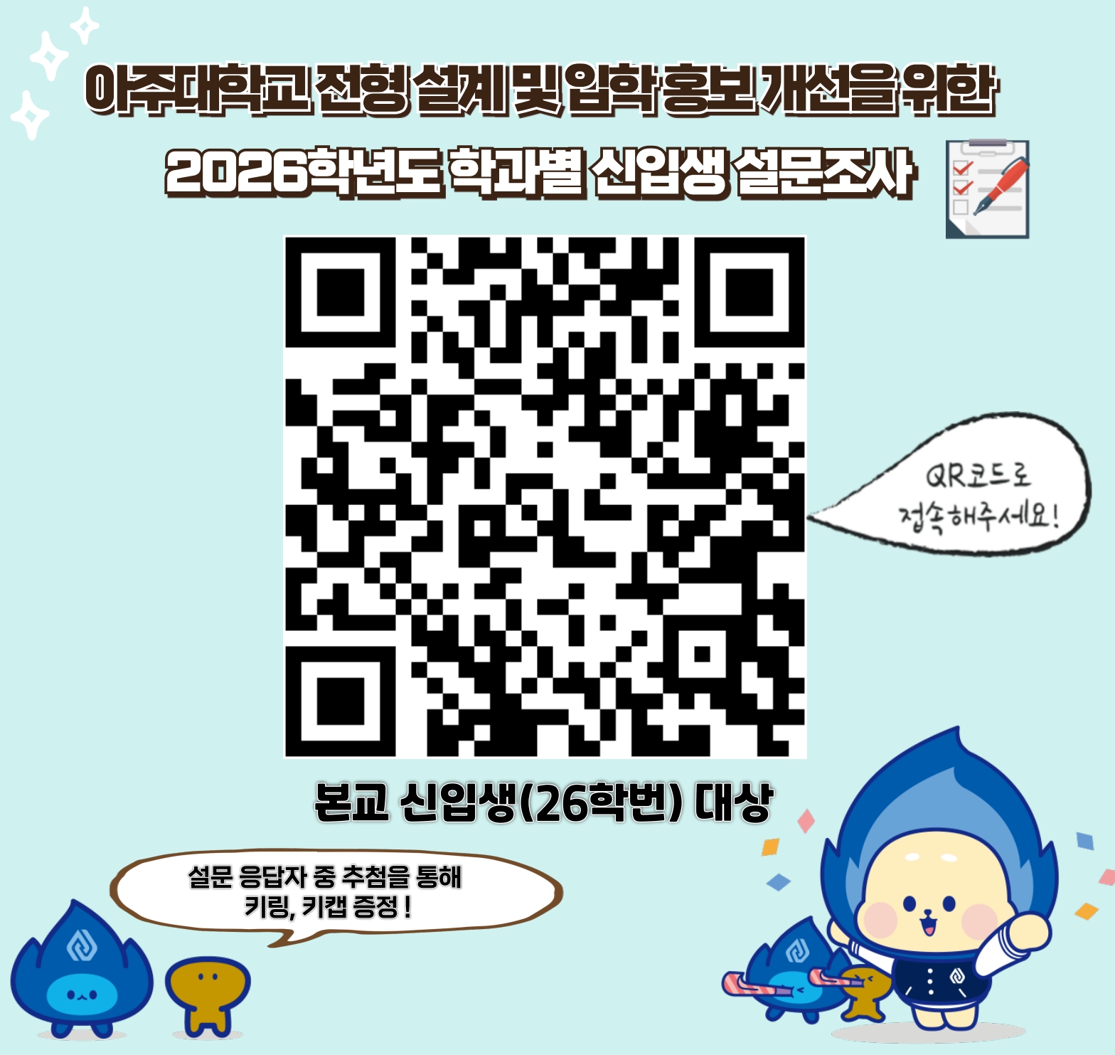 아주대학교 입학처에서는 2026학년도 신입학생을 대상으로 입학전형 개선에 대한 기초자료 수집을 위하여 다음과 같이 설문조사를 진행하고 있습니다. 2026학년도 신입학생은 아래 링크 또는 QR코드에 접속하여 설문조사에 참여해주시기 바랍니다.