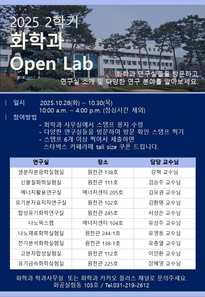화학과 연구실을 방문하고 연구실 소개도 받고, 방문 스탬프를 모으면 스타벅스 카페라떼 Tall 사이즈 쿠폰 드립니다.