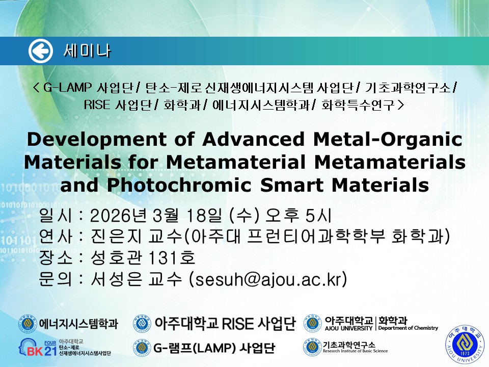 [2026.03.18.(수)] < G-LAMP 사업단 / 탄소-제로 신재생에너지시스템 사업단 / 기초과학연구소 / RISE 사업단 / 화학과 / 에너지시스템학과 / 화학특수연구 > 세미나 안내