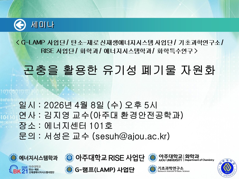[공지] [2026.04.08.(수)] < G-LAMP 사업단 / 탄소-제로 신재생에너지시스템 사업단 / 기초과학연구소 / RISE 사업단 / 화학과 / 에너지시스템학과 / 화학특수연구 > 세미나 안내