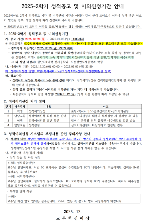 2025-2학기 성적 이의 신청 관련 유의사항 안내