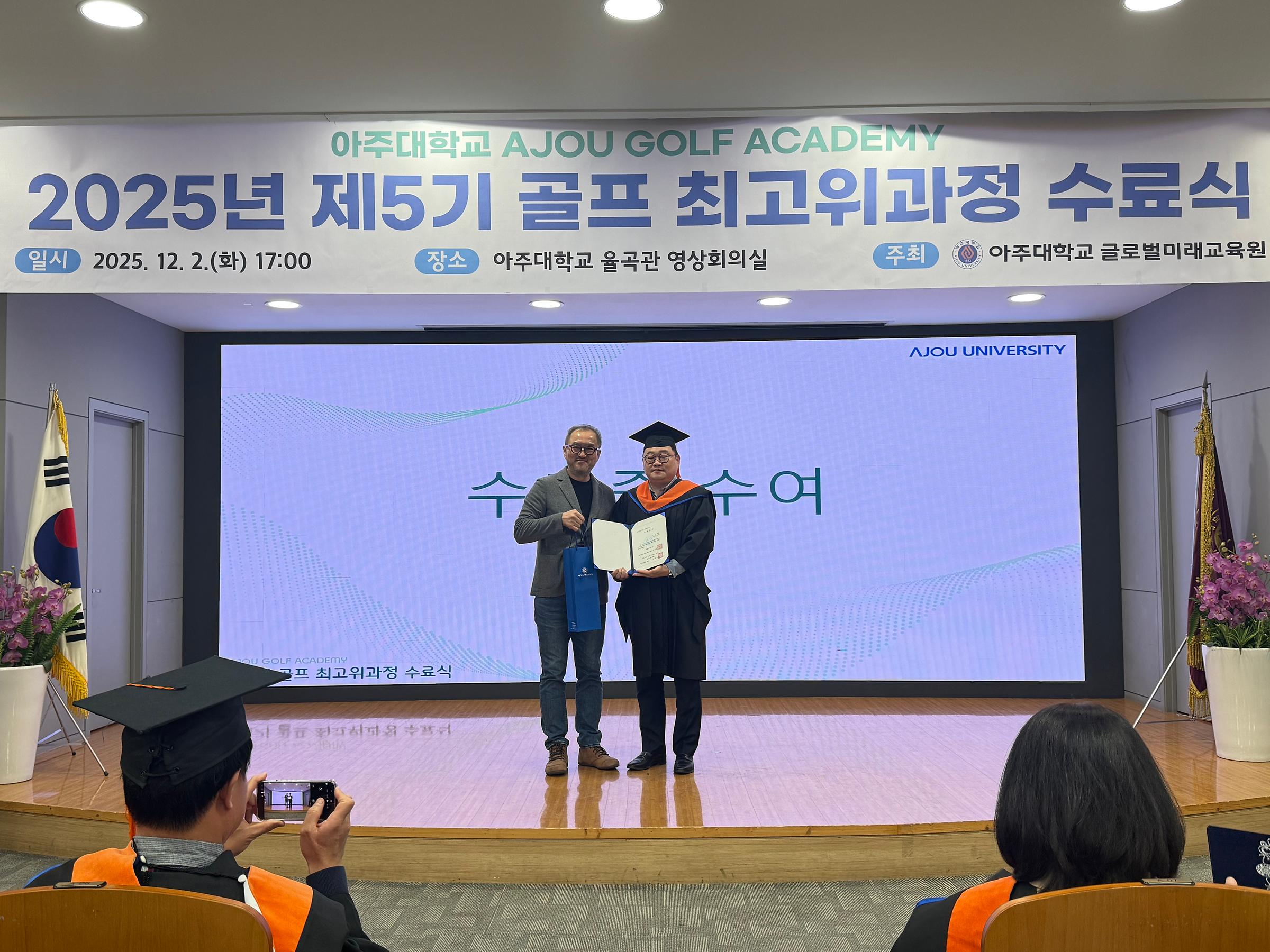 아주대학교 글로벌미래교육원은 지난 12월 2일 율곡관 영상회의실에서 제5기 골프 최고위과정 수료식을 성공적으로 마무리하며 총 10명의 수료생을 배출했다.
