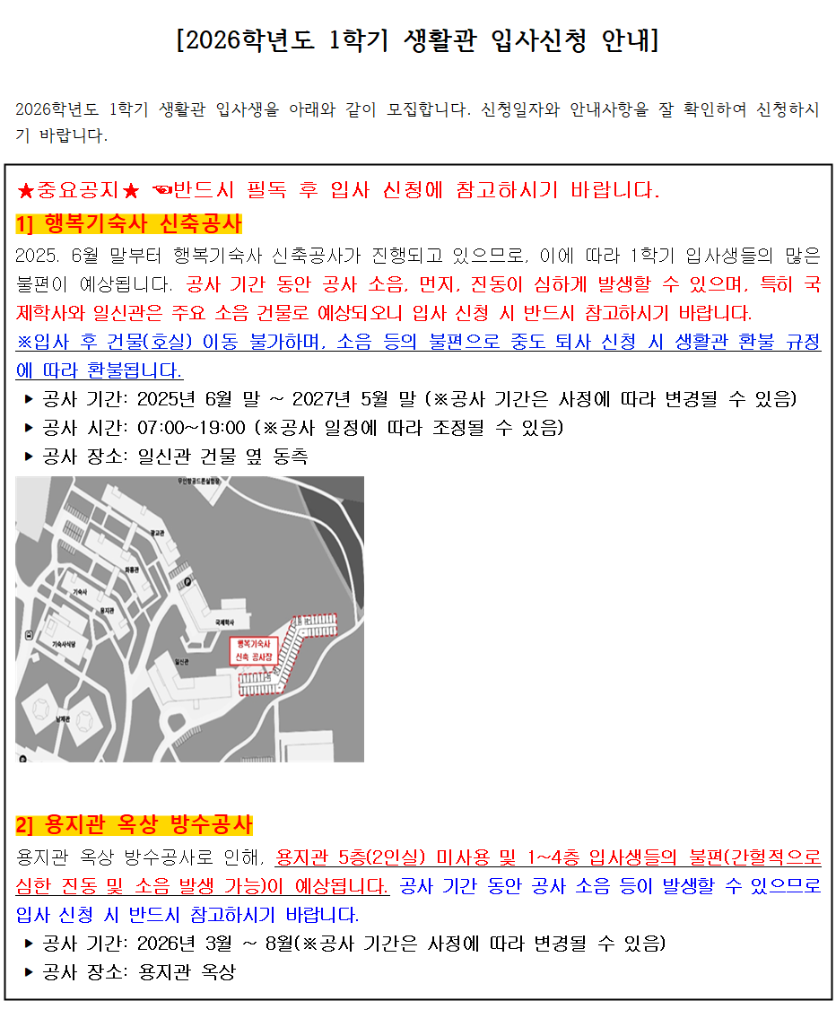 [2026학년도 신입생 생활관(기숙사)1차 선발 안내 ] ☜ 클릭