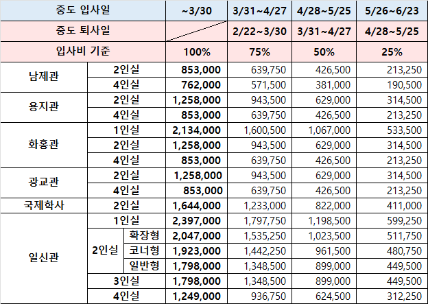※의학과 3~6학년은 생활관 홈페이지 > 입퇴사안내 > 중도입퇴사 금액 참고