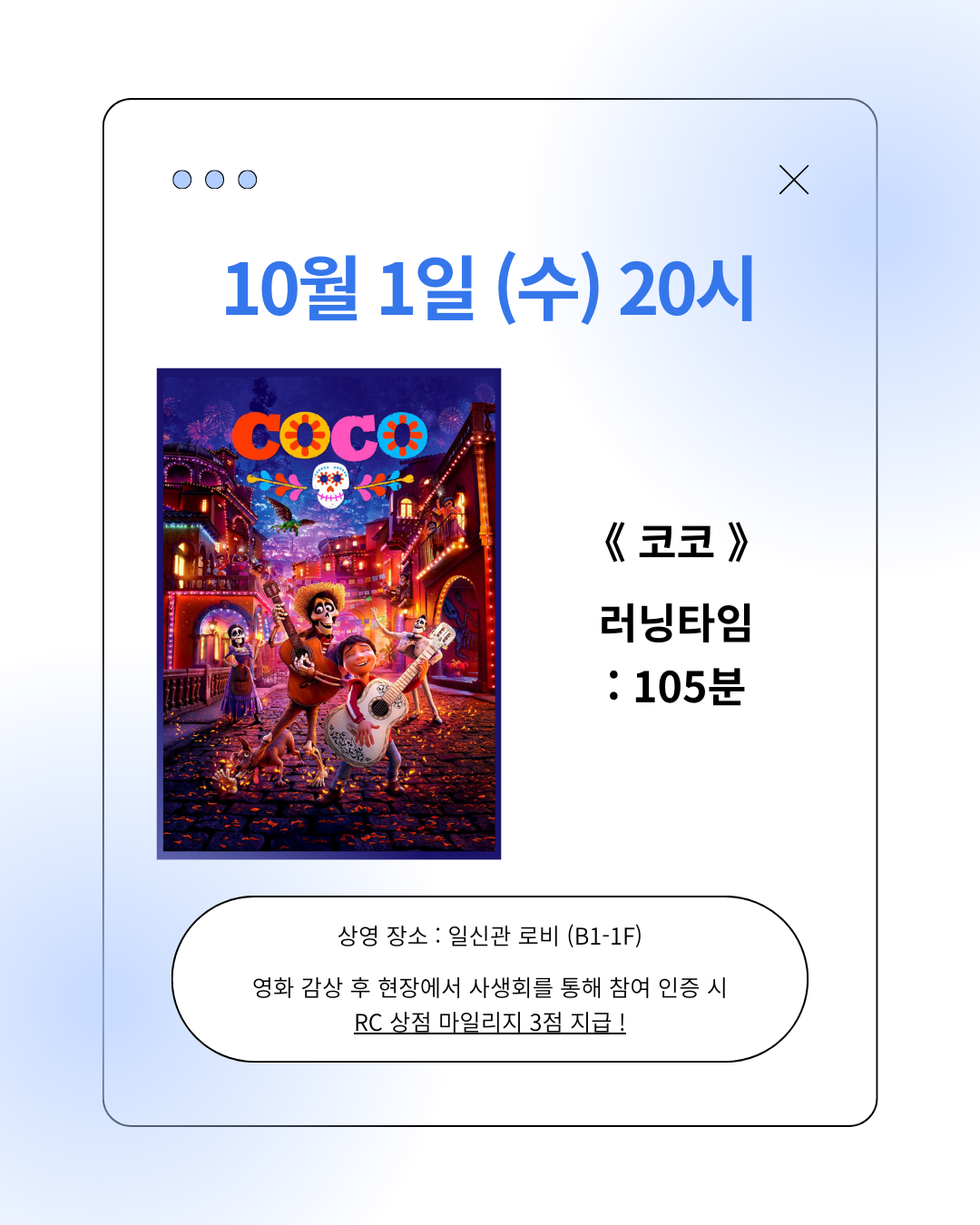 (유의사항) 일신관 로비(B1F~1F 사이 계단)에서 영화 상영으로 인해 주변 조명이 소등되며, 스피커 음량으로 인해 소음이 발생할 수 있습니다. 하단의 상영 일정을 미리 확인하시어 로비 이용에 참고 바라며, 다소 불편하시더라도 생활관 RC 프로그램 및 사생회 행사에 양해와 협조를 부탁드립니다.