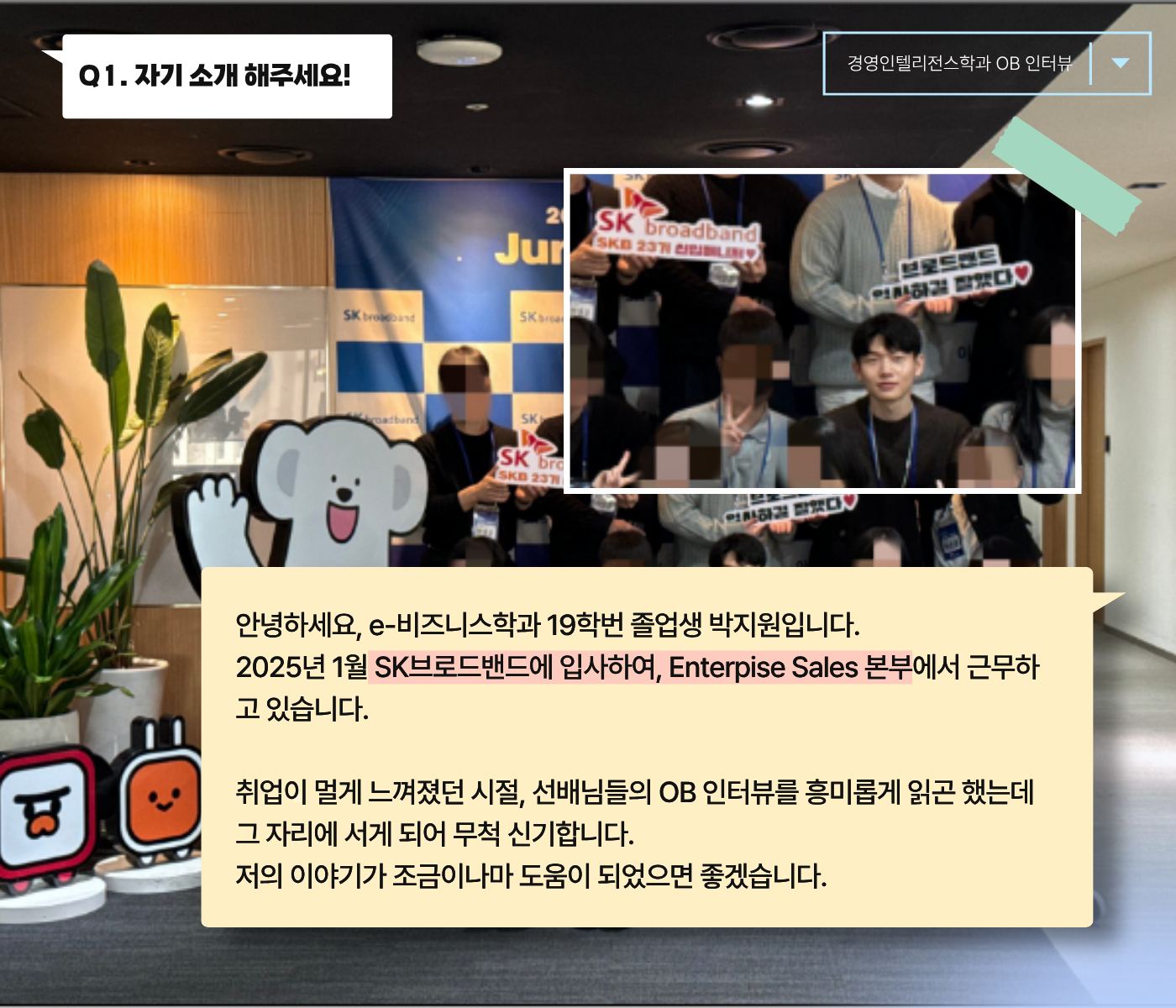 이번 주인공은 SK브로드밴드 B2B 영업 직무에서 활약 중인 19학번 박지원 선배님입니다!