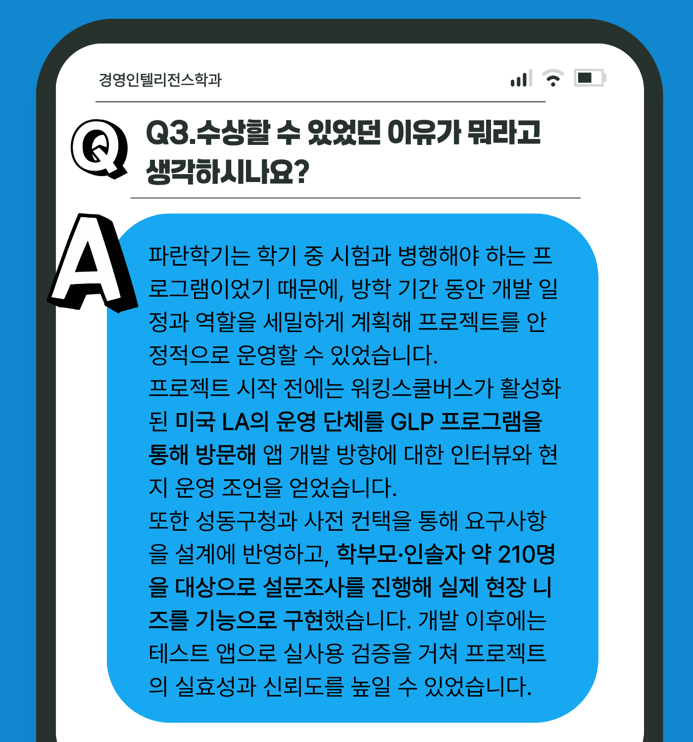 워킹스쿨버스 운영을 디지털로 관리·지원하기 위한 공공서비스 앱 개발 프로젝트로 파란학기에 참가하여 수상한 팀이죠.