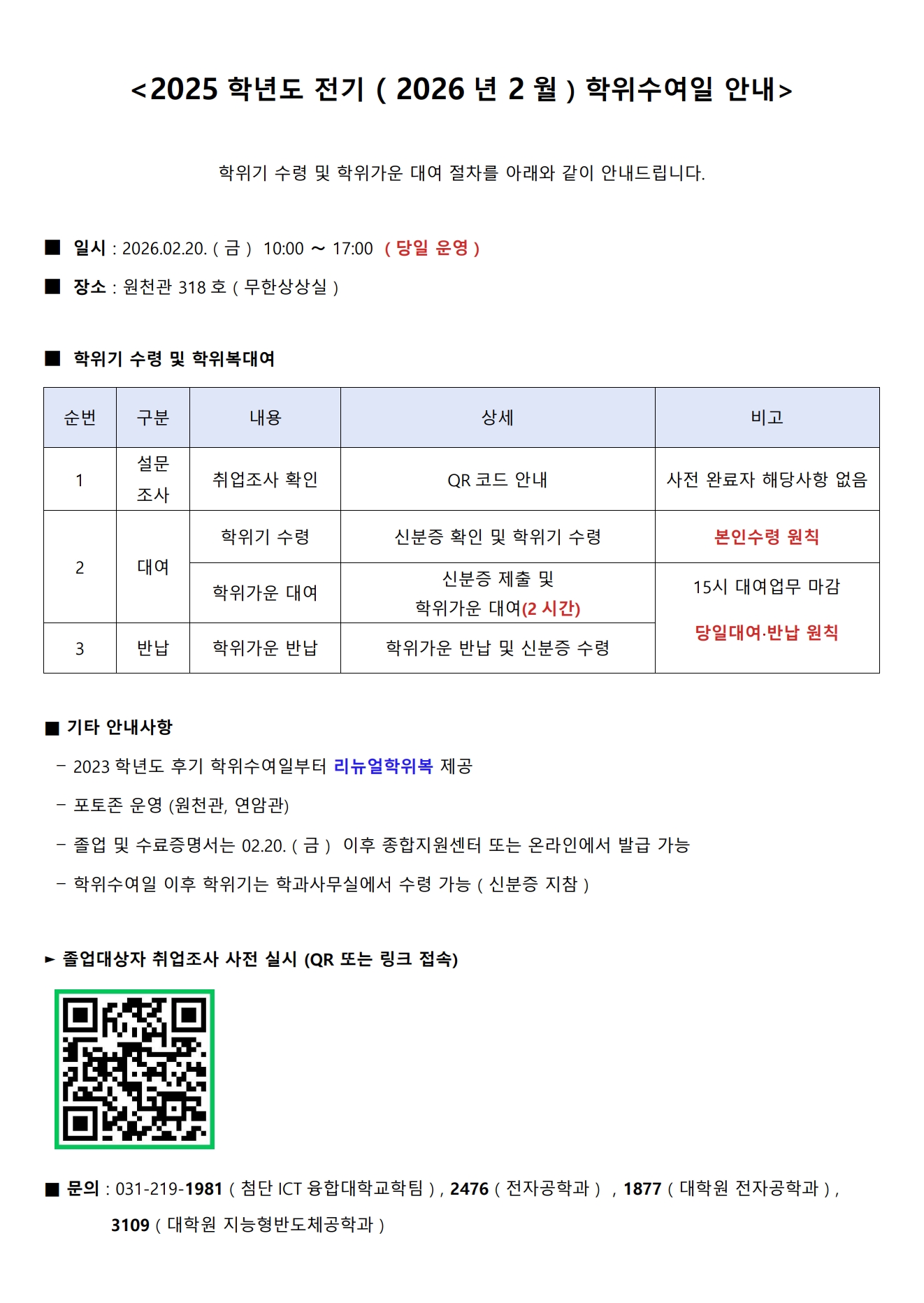 - 학위 가운 대여 시, 취업설문조사 참여 필수 (위 해당 QR 또는 설문조사 ◀클릭 )