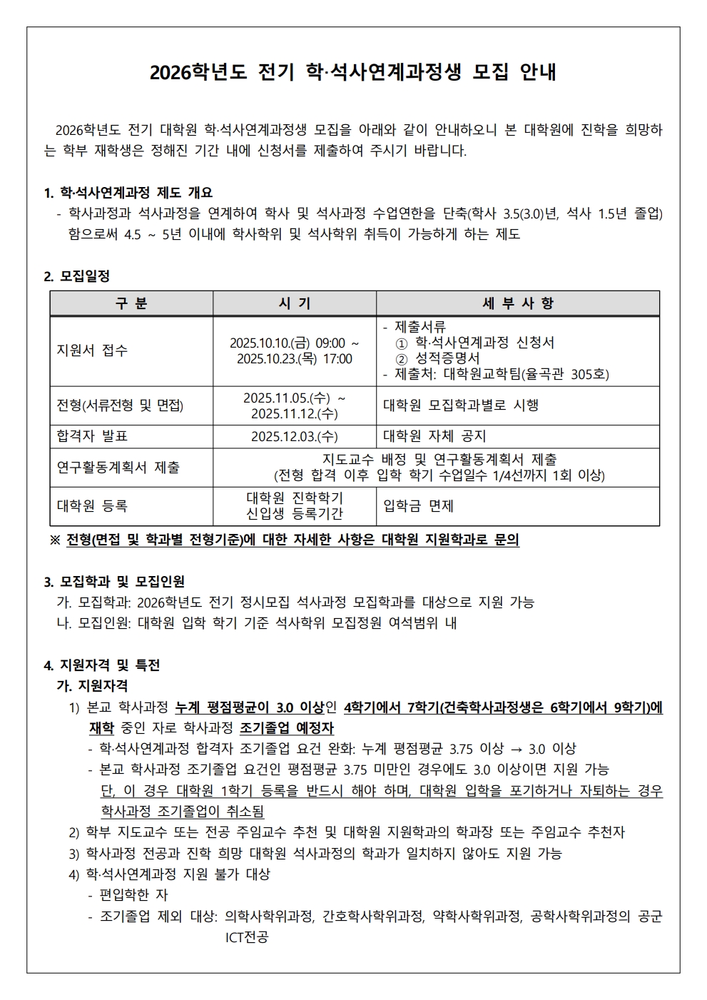 [기타] 2026학년도 전기 학‧석사연계과정생 모집 안내