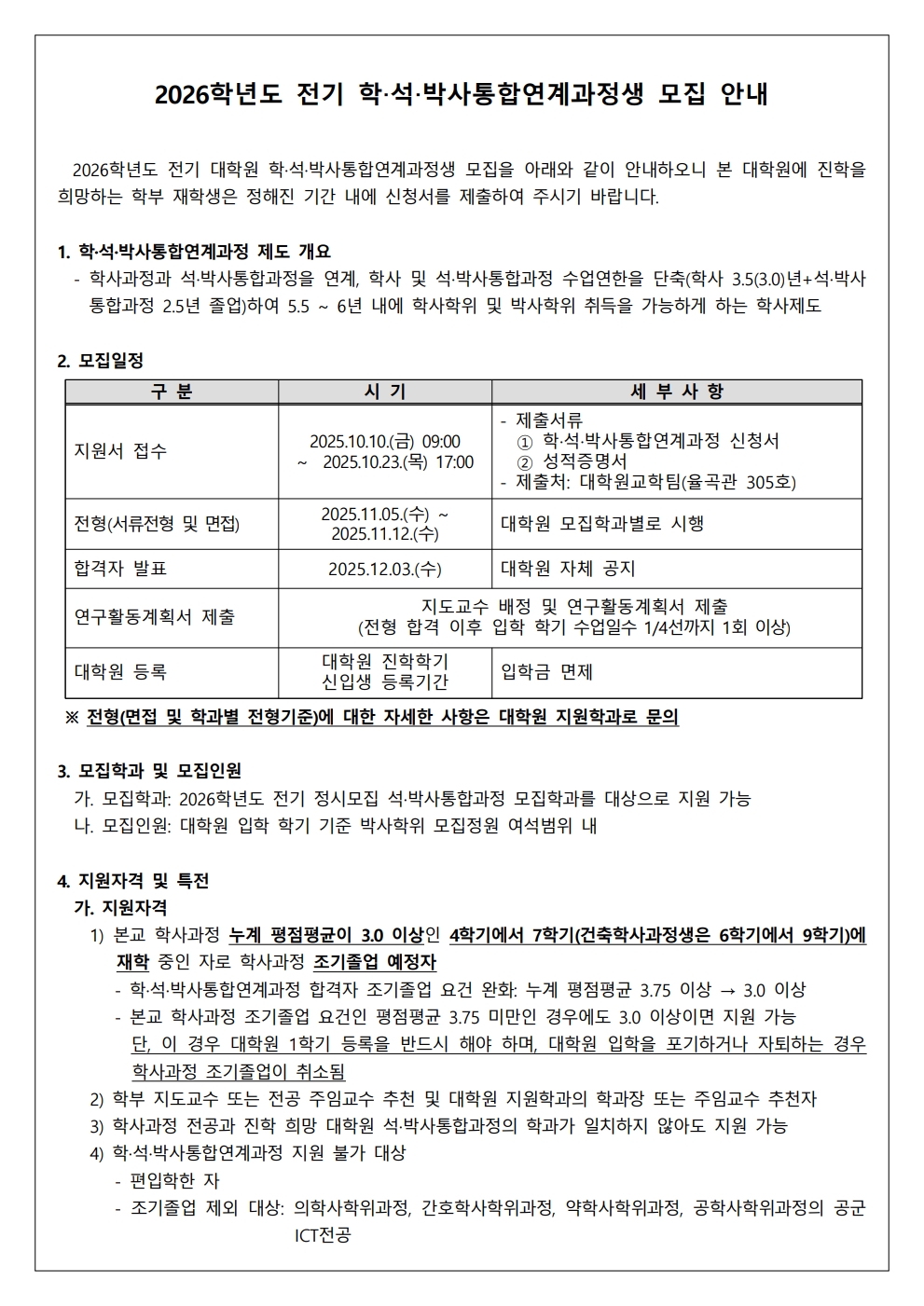 2026학년도 전기 학‧석‧박사통합연계과정생 모집 안내