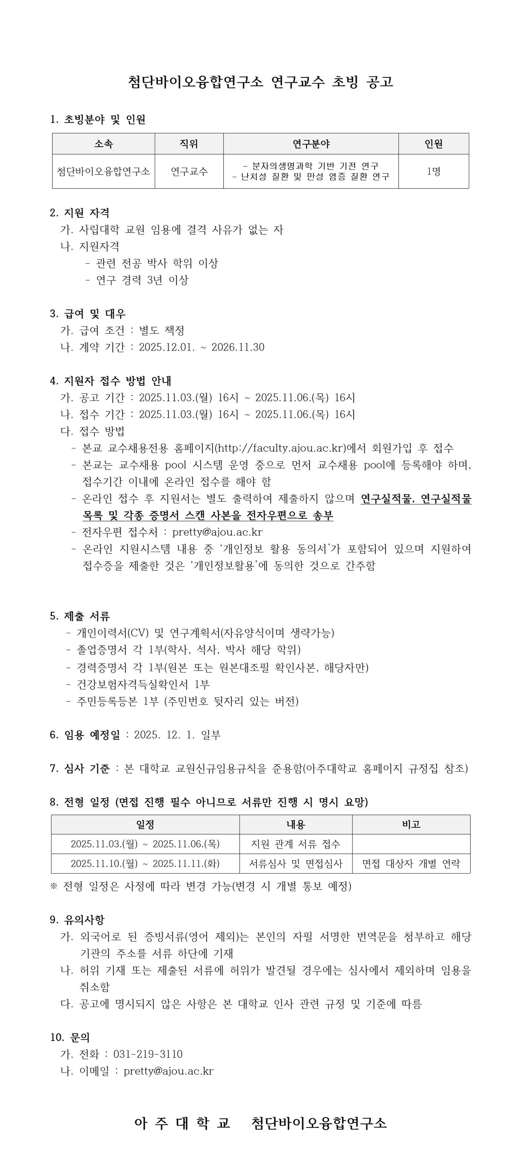 2025학년도 2학기 아주대학교 첨단바이오융합연구소 연구교수 초빙 공고