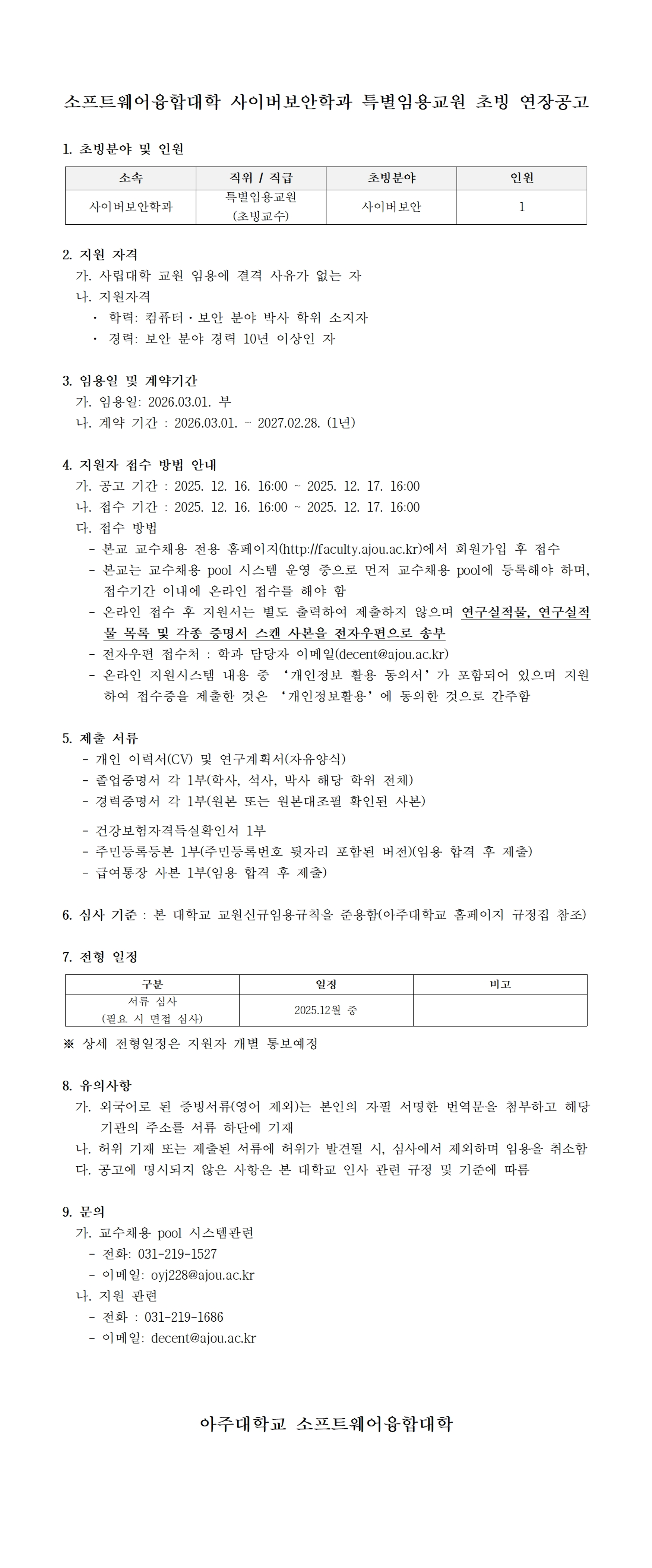 2026학년도 1학기 아주대학교 소프트웨어융합대학 사이버보안학과 특별임용교원(초빙교수) 초빙 연장공고