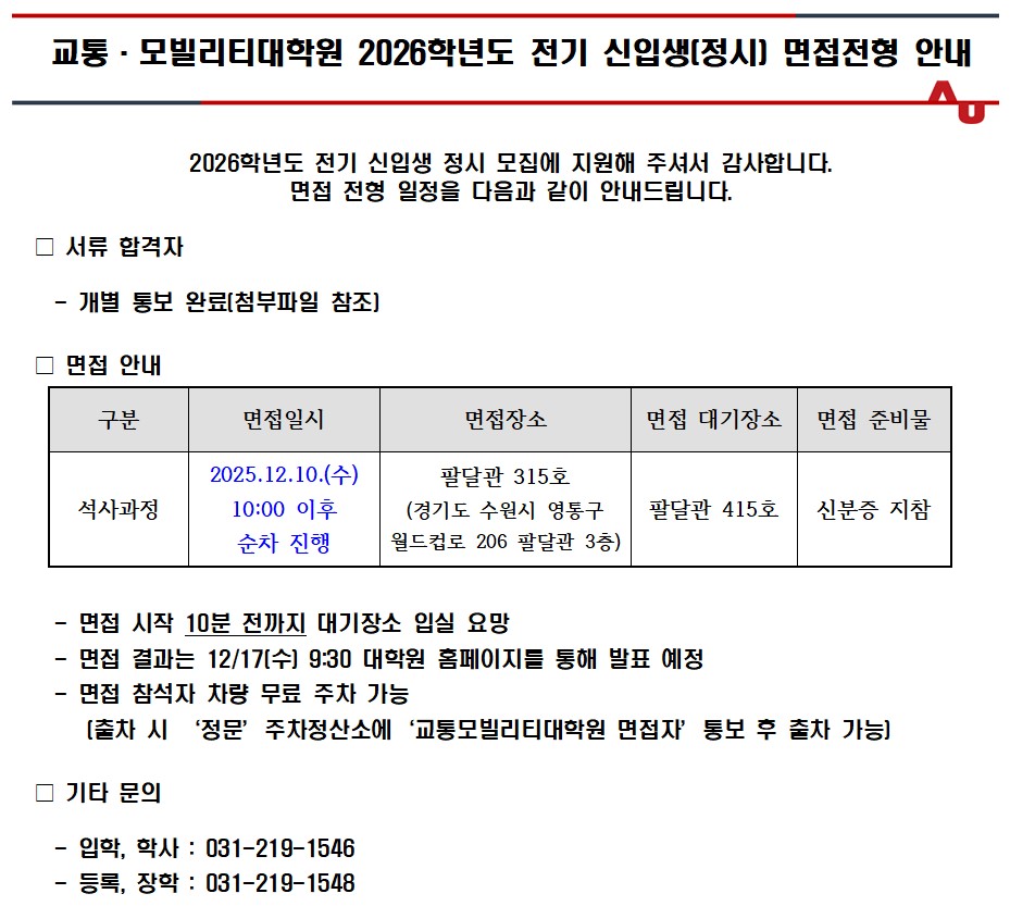 [학사] 교통·모빌리티대학원 2026학년도 전기 신입생 정시모집 면접전형 안내