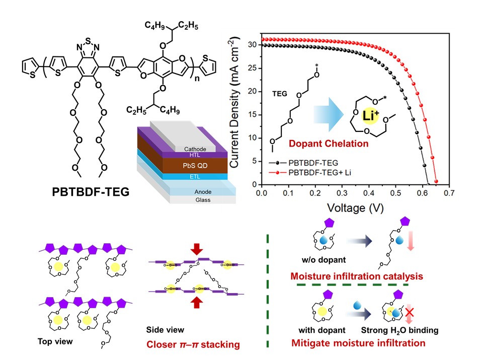 이 교수팀은 리튬 기반 도판트를 킬레이트(chelation) 방식으로 고정할 수 있는 소재(PBTBDF-TEG)를 개발해 불안정 문제를 해결했다. PBTBDF-TEG는 전도성 고분자 기반 정공 전달 소재로서 벤조디푸란(benzodifuran) 기반 공액 고분자에 에틸렌 글리콜 곁사슬을 도입했다. 에틸렌 글리콜 곁사슬과 리튬 이온이 결합하면서 도판트가 안정화됐고, 고분자 적층 간격이 감소하면서 전하 이동도 더 원활해졌다. 양자점 태양전지의 광전변환효율(PCE)은 13.7%을 달성했고, 수분 억제력도 좋아 초고습 환경에서 24시간 이상 90% 이상의 성능을 유지하는 데 성공했다.