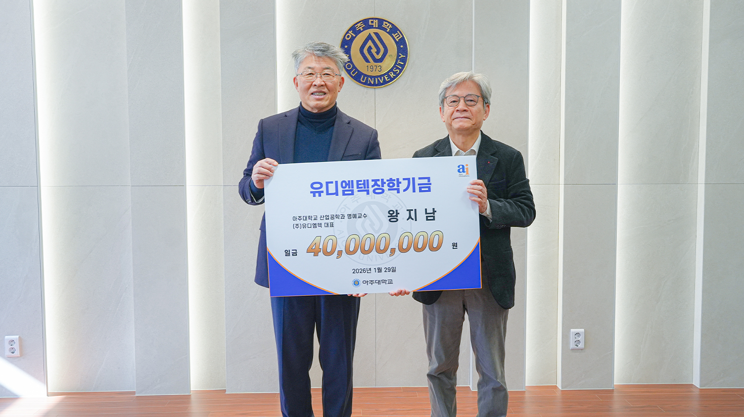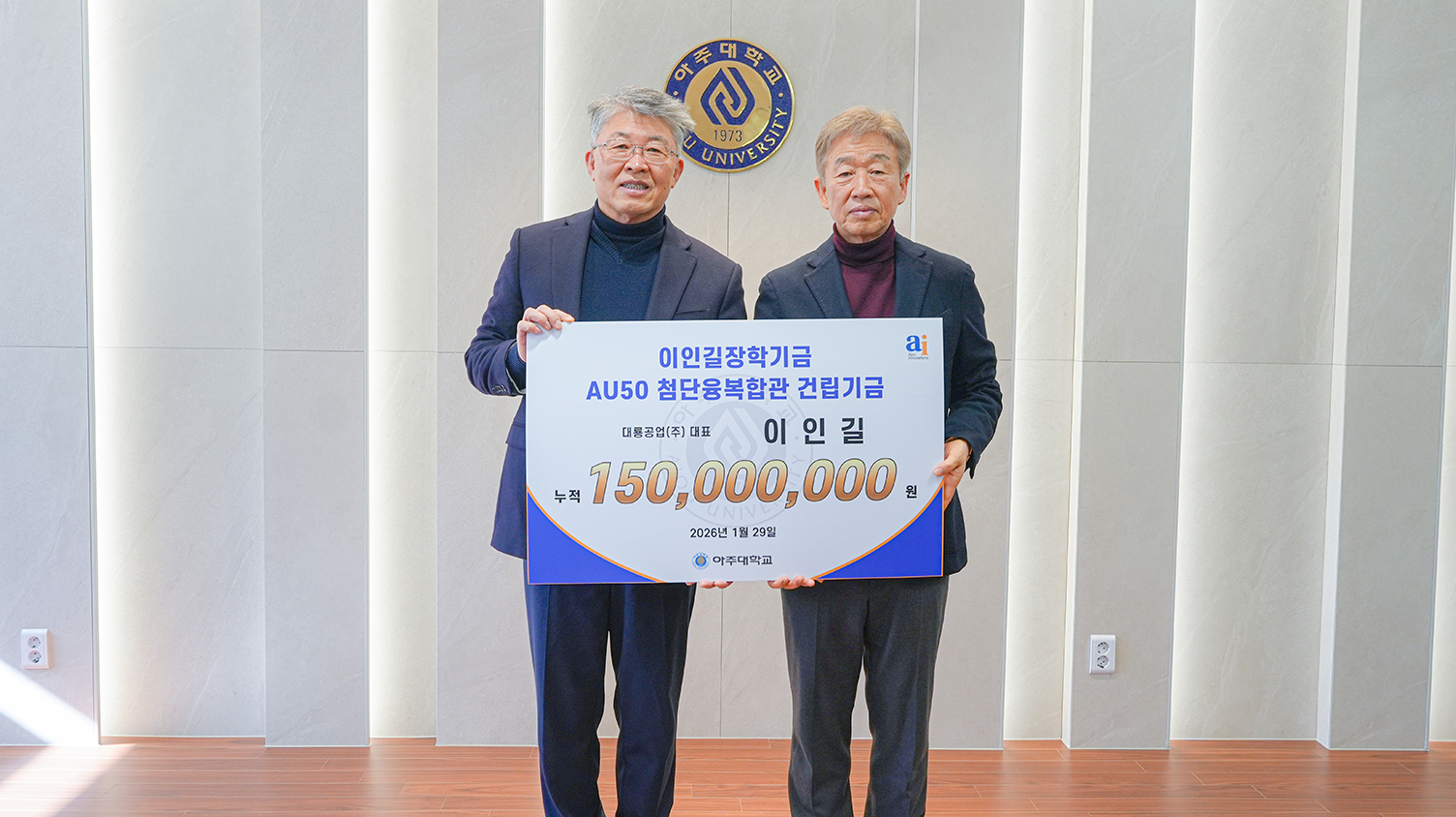 ㈜대룡공업 대표 이인길 기부자는 아주대 화학공학과 동문(73학번)으로 아주대 총동문회 5·6대 회장을 역임했다. 이번 기부금 전달식에서 이인길 기부자는 화학공학과를 비롯한 이공계열 학생들을 위해 ‘이인길 장학기금’으로 5000만원을 기부했다. 이인길 대표는 지난 2023년부터 ‘AU50 첨단융복합관 건립기금’ 기부를 이어왔고, 누적 기부금은 총 1억5000만원에 달한다.