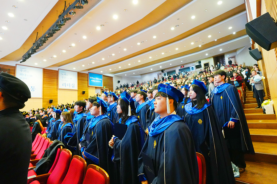 이어진 학위수여 순서에서는 박사와 석사, 학사 졸업생들에게 차례로 학위기가 수여됐다. 학부에서는 각 단과대학 대표 학생이 무대에 올라 학위를 받으며 졸업의 의미를 더했다.