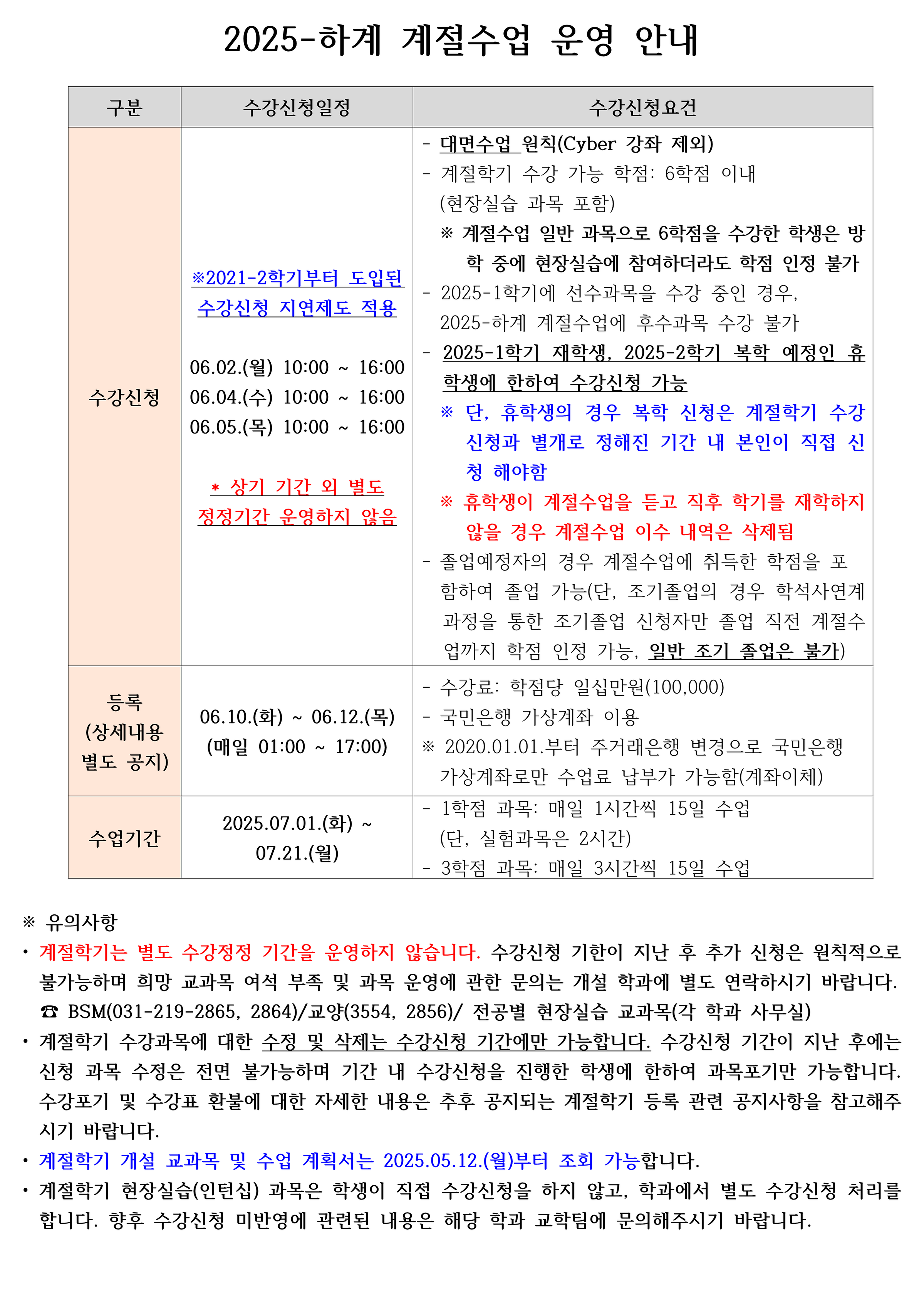 ☞ 2025학년도 하계 계절수업 등록 및 수강포기(계절학기 수강료 환불) 안내