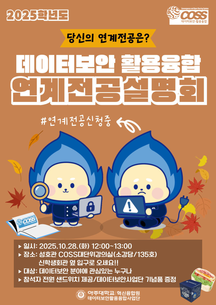 데이터보안에 관심 있는 아주대 재학생이라면 누구나 참석할 수 있으니 오셔서 샌드위치와 기념품도 받으시고 연계전공 정보도 얻어가세요~!