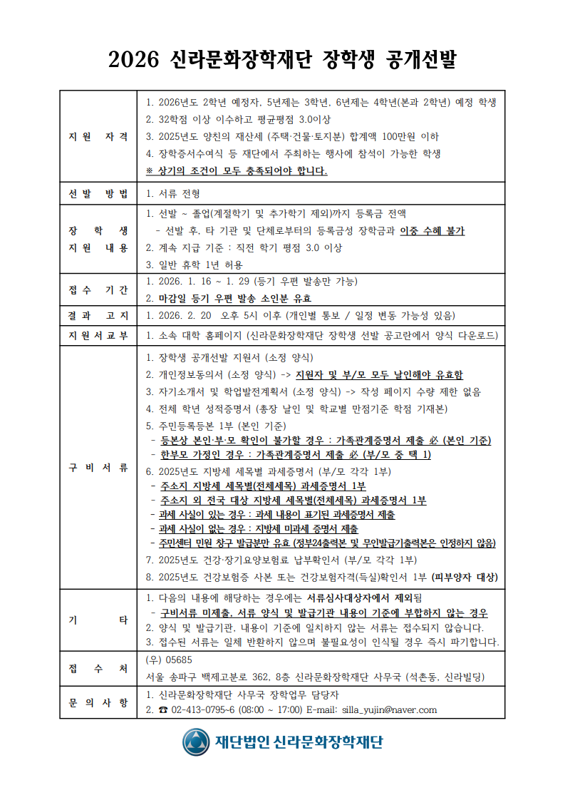 [장학] [교외장학] 2026 신라문화장학재단 장학생 공개선발