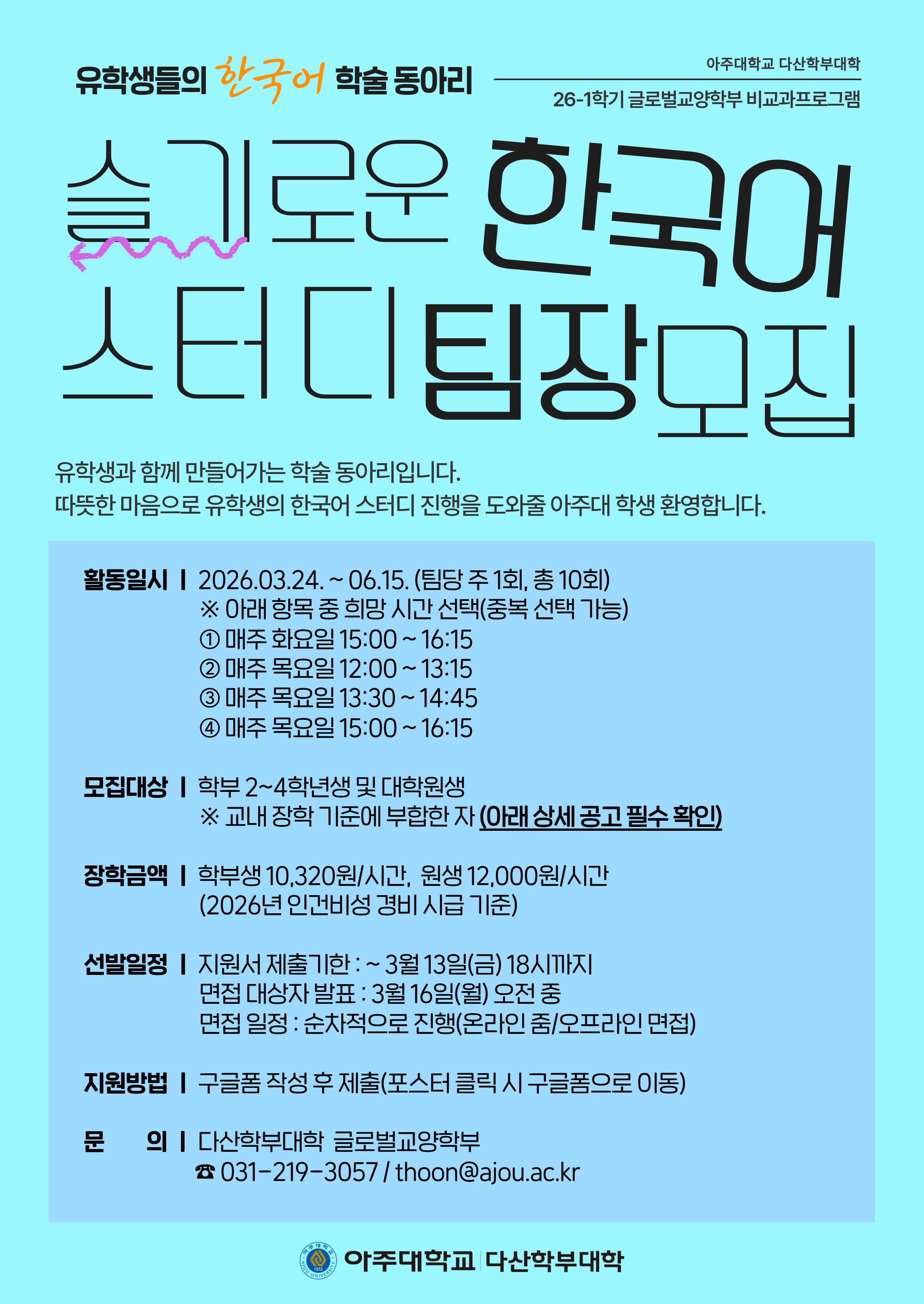 [비교과] [글로벌교양학부] 26-1 슬기로운 한국어 스터디 팀장 모집(~3/13)