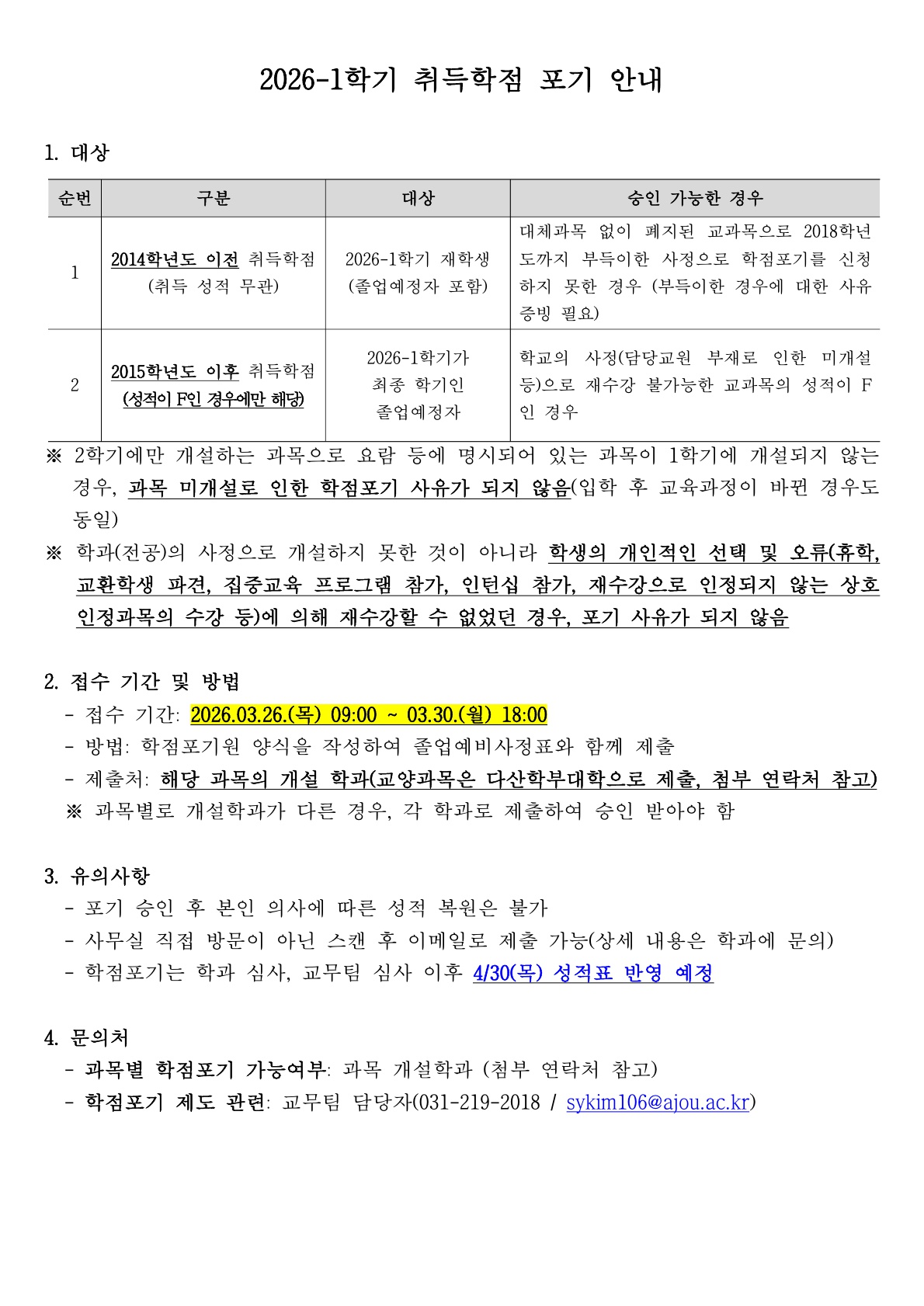 - 학점포기 제도 관련: 교무팀 담당자(031-219-2018 / sykim106@ajou.ac.kr)