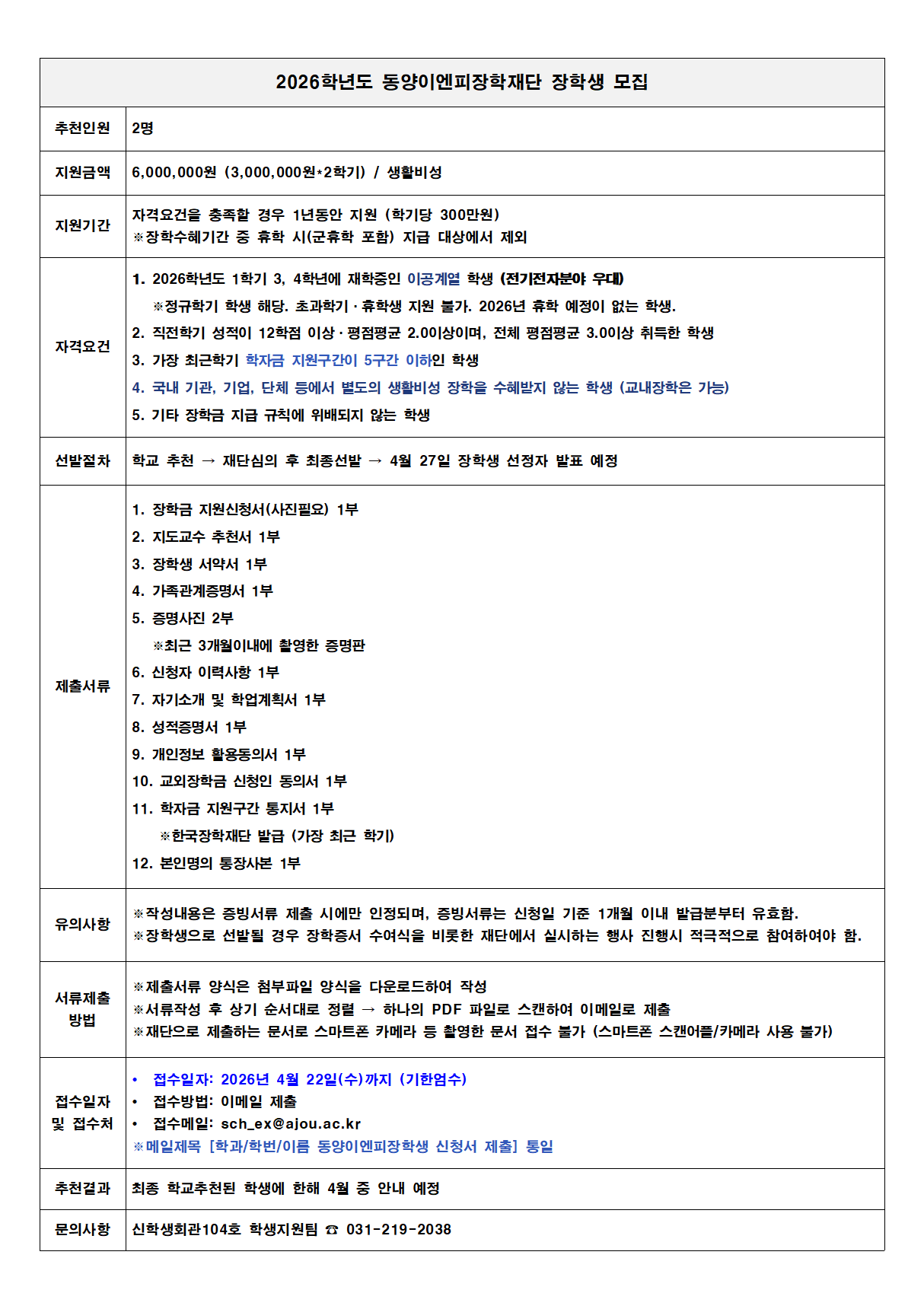 [장학] [교외장학] 2026년 동양이엔피장학재단 장학생 모집 (~2026.04.22.(수)까지)
