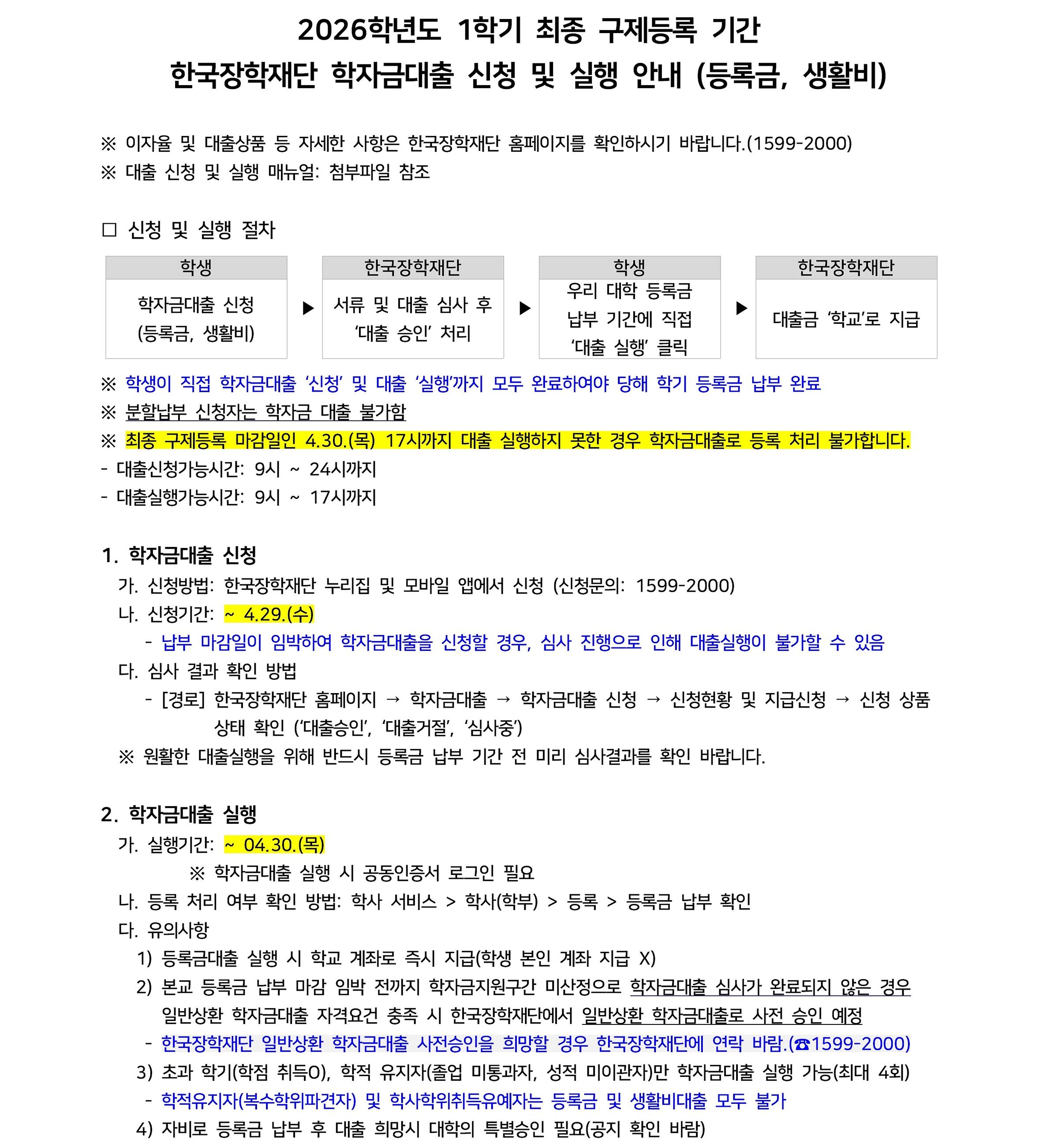[장학] [학자금대출] 2026-1 최종 구제등록 기간 한국장학재단 학자금대출 안내