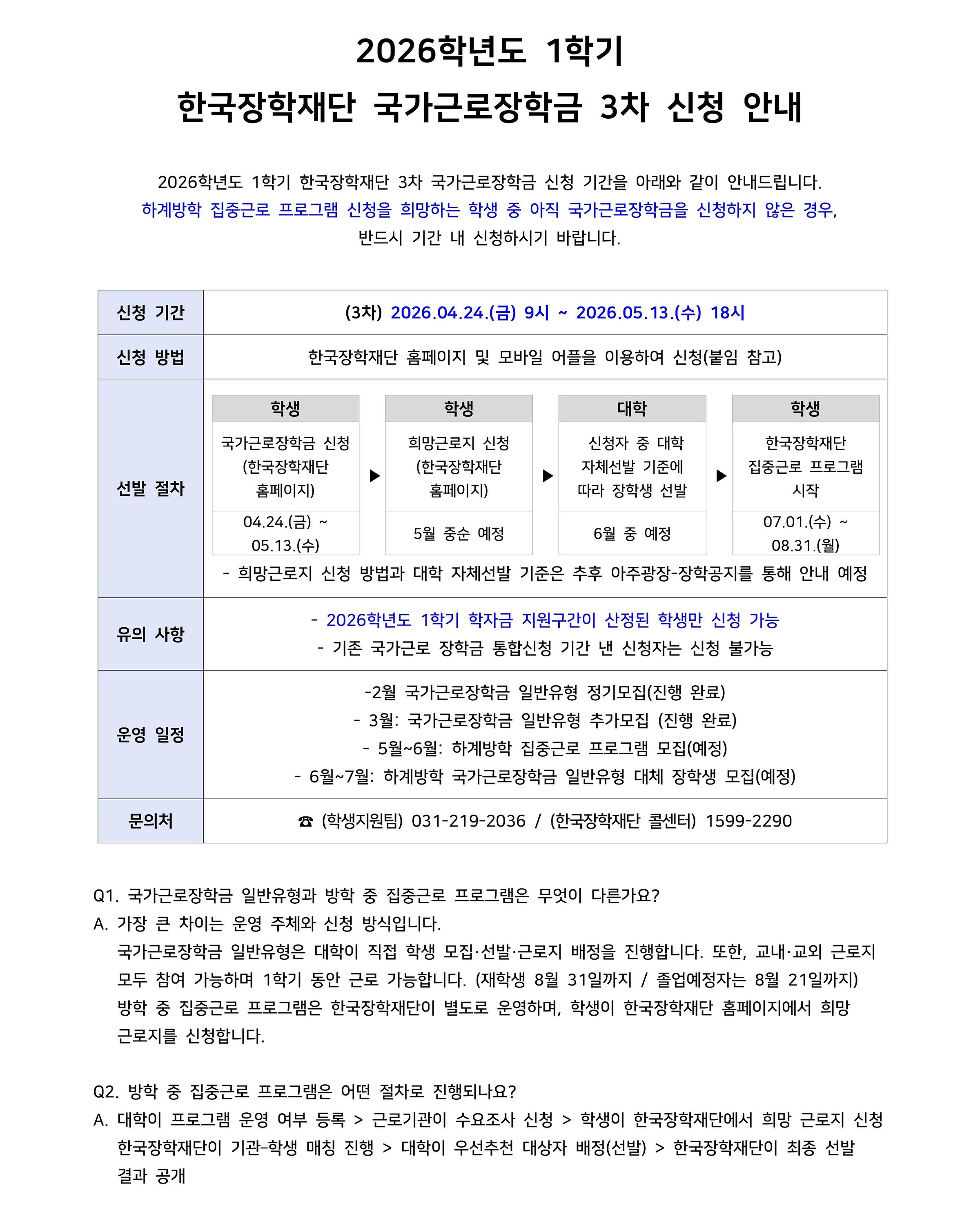 [장학] [국가근로] 2026학년도 1학기 한국장학재단 국가근로장학금 3차 신청 안내(4.24.~5.13.)