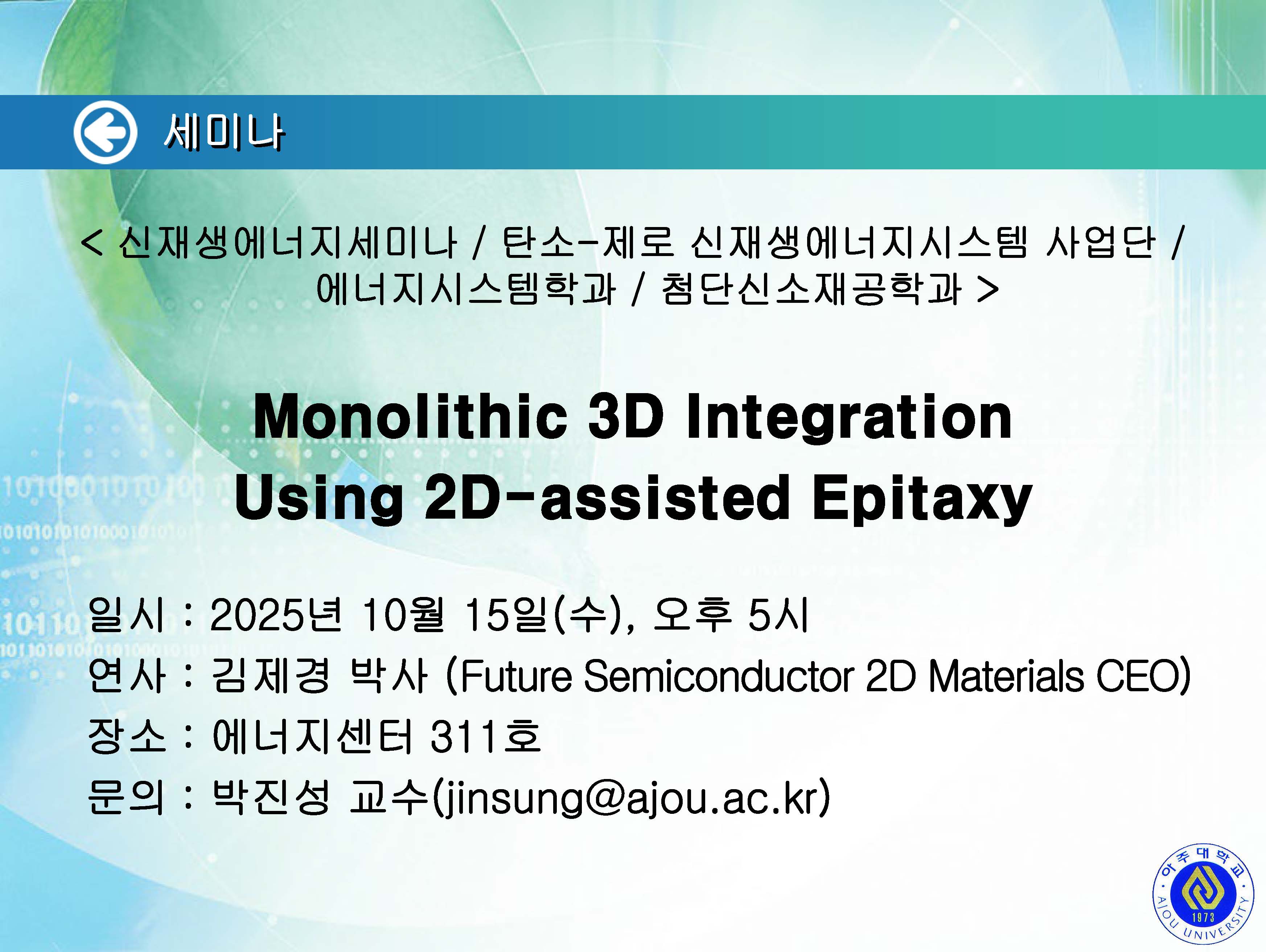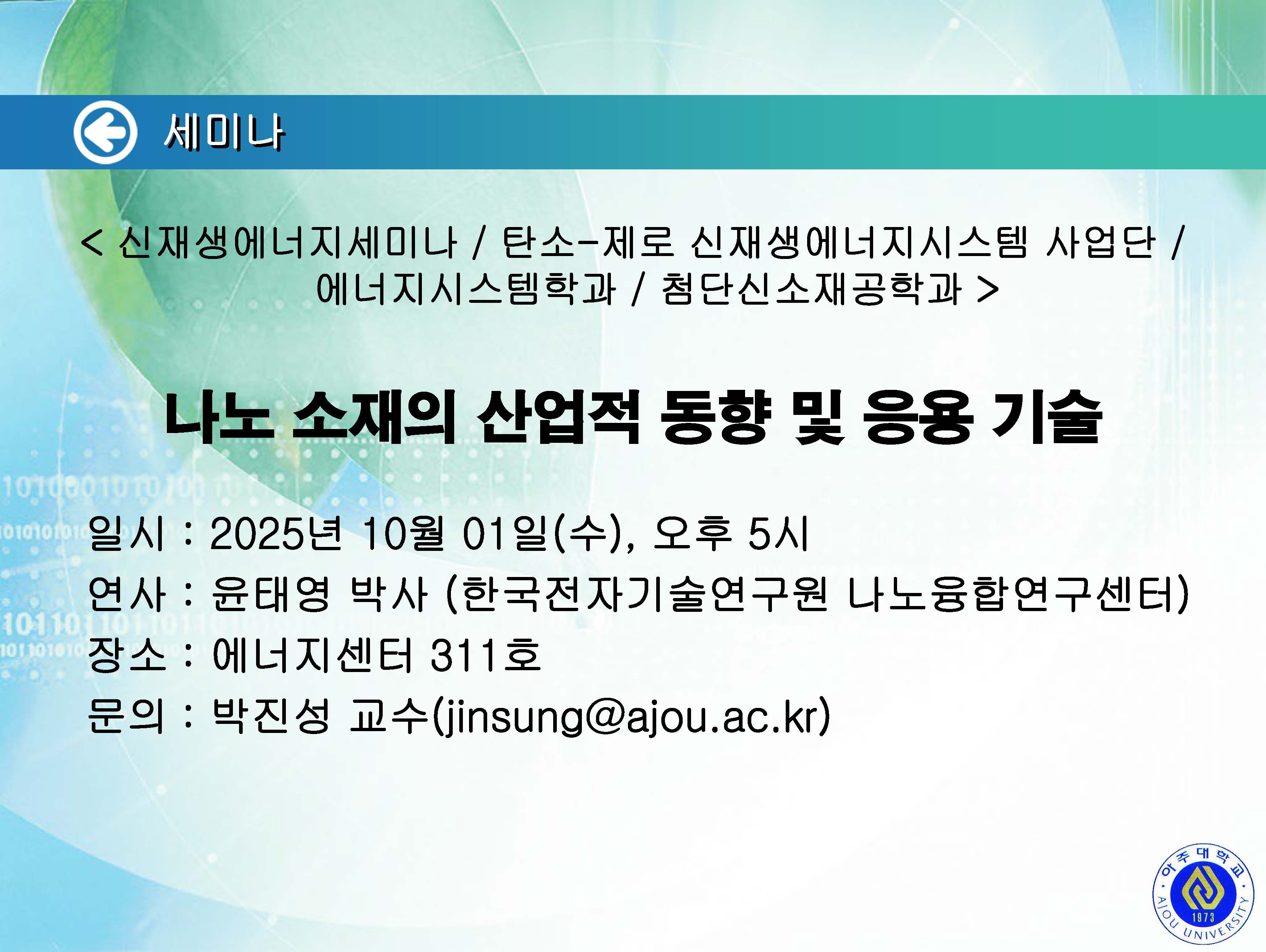 [2025.10.01.수] <신재생에너지세미나 / 탄소-제로 신재생에너지시스템 사업단 / 에너지시스템학과 / 첨단신소재공학과> 세미나 안내