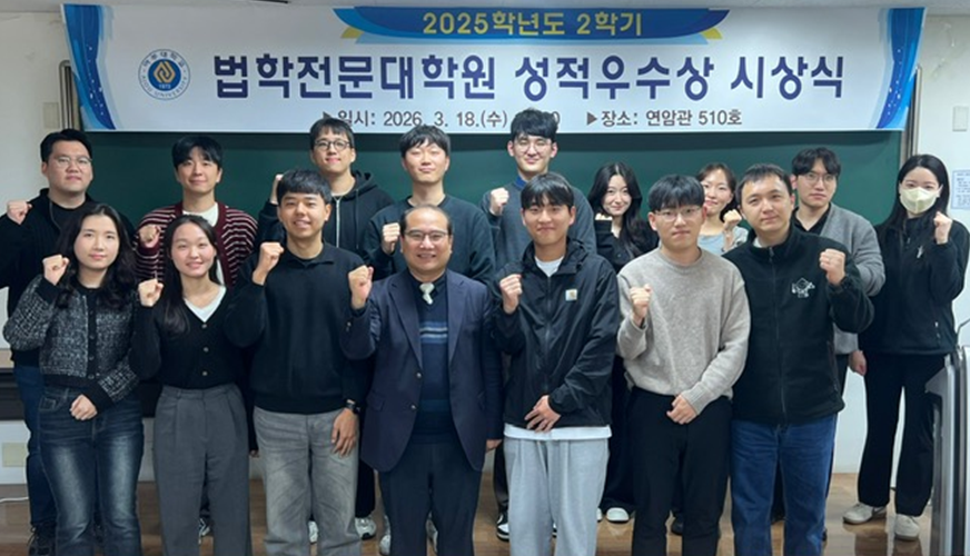 우리 법전원은 2026년 3월 18일 연암관 510호에서 ‘2025학년도 2학기 법학전문대학원 성적우수상 시상식’을 개최했다.