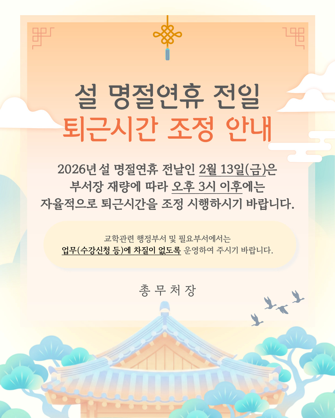 아주대학교 총무팀 공지에 따른 설 명절연휴 전일 퇴근시간 조정 시행에 따라