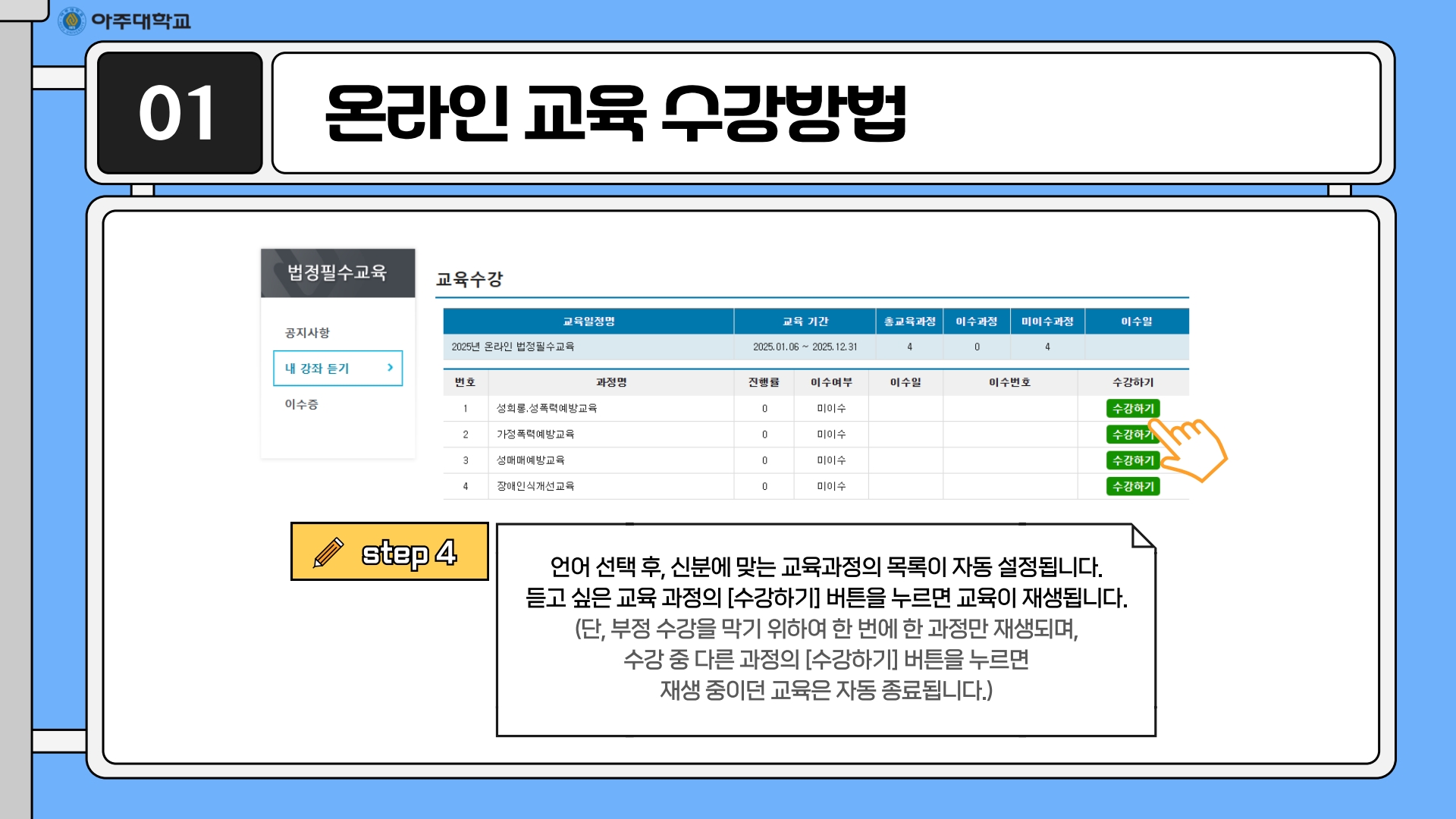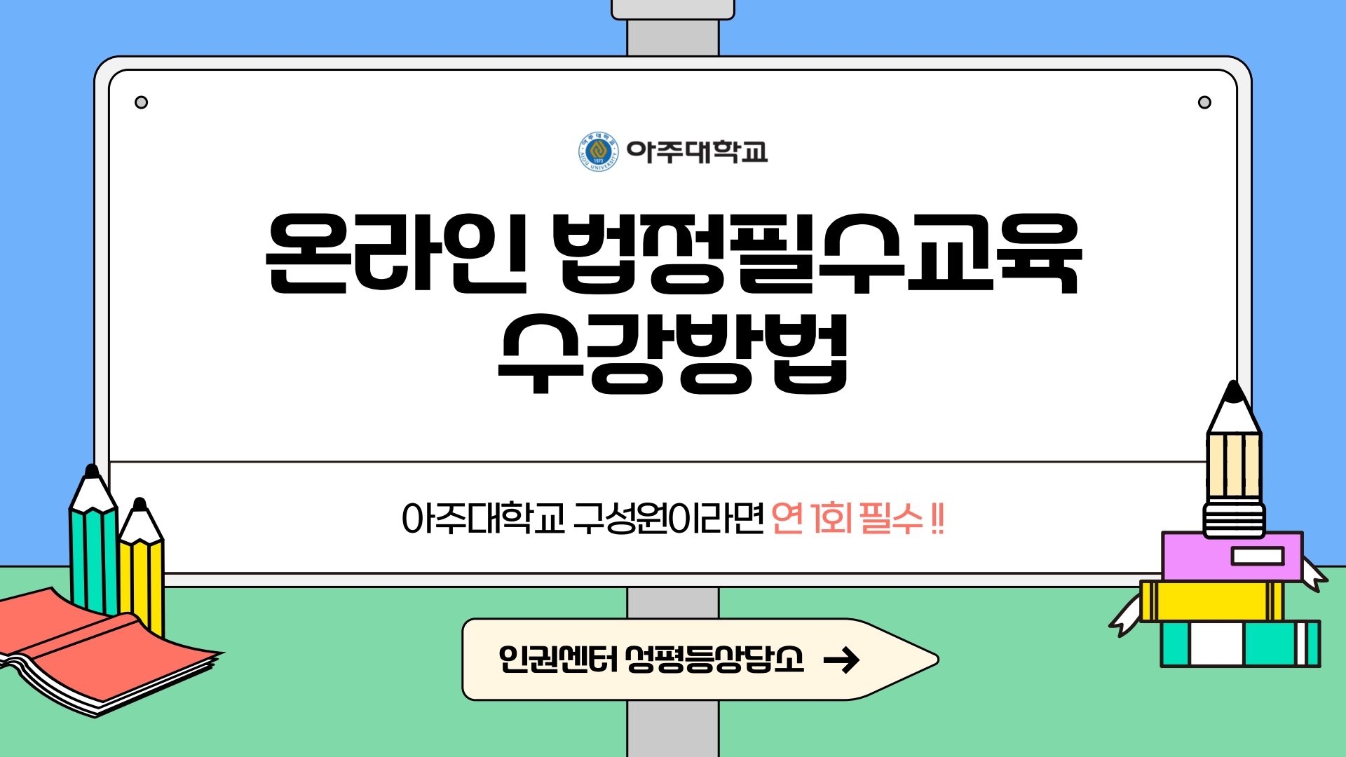• 온라인 (아주대학교 포탈 → 주요서비스 → 인권센터 온라인 교육)