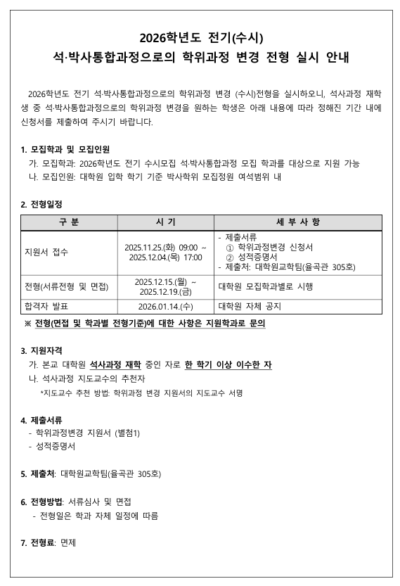 [학사] [자연대/대학원] 2026학년도 전기 석,박사통합과정으로의 학위과정변경 모집전형(수시) 안내