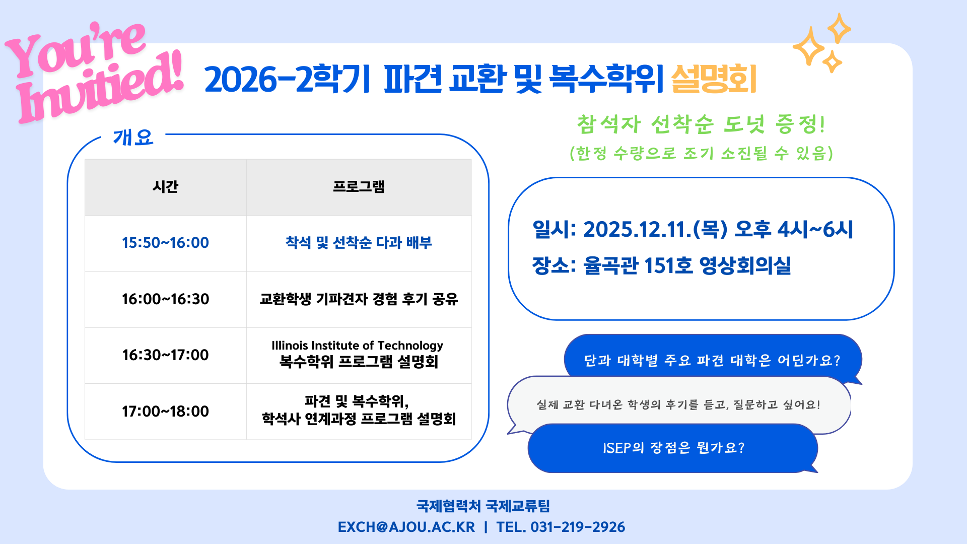 더불어 오는 12월 11일 진행 예정인 2026-2학기 파견 설명회 행사 또한 많은 관심과 참석 바랍니다.