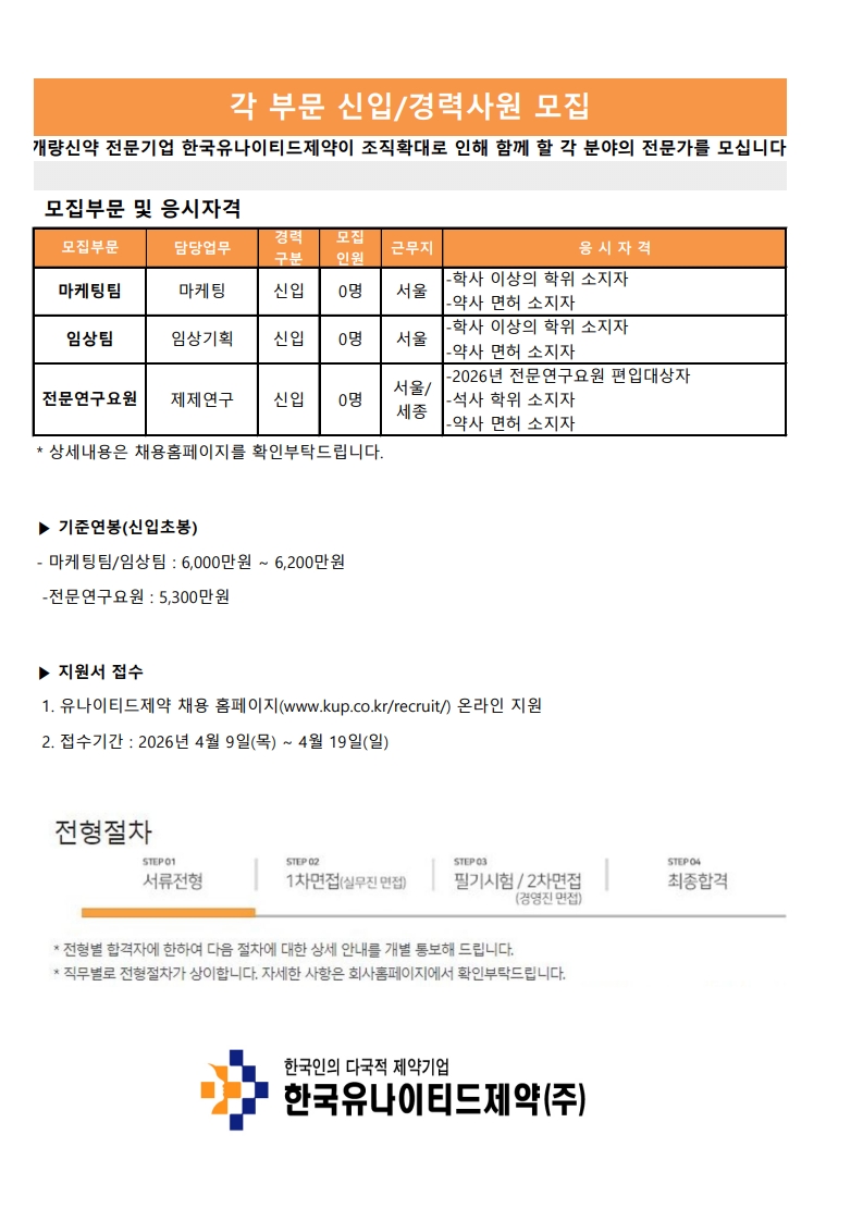 [취업] [한국유나이티드제약] 마케팅팀/임상팀/전문연구요원 채용