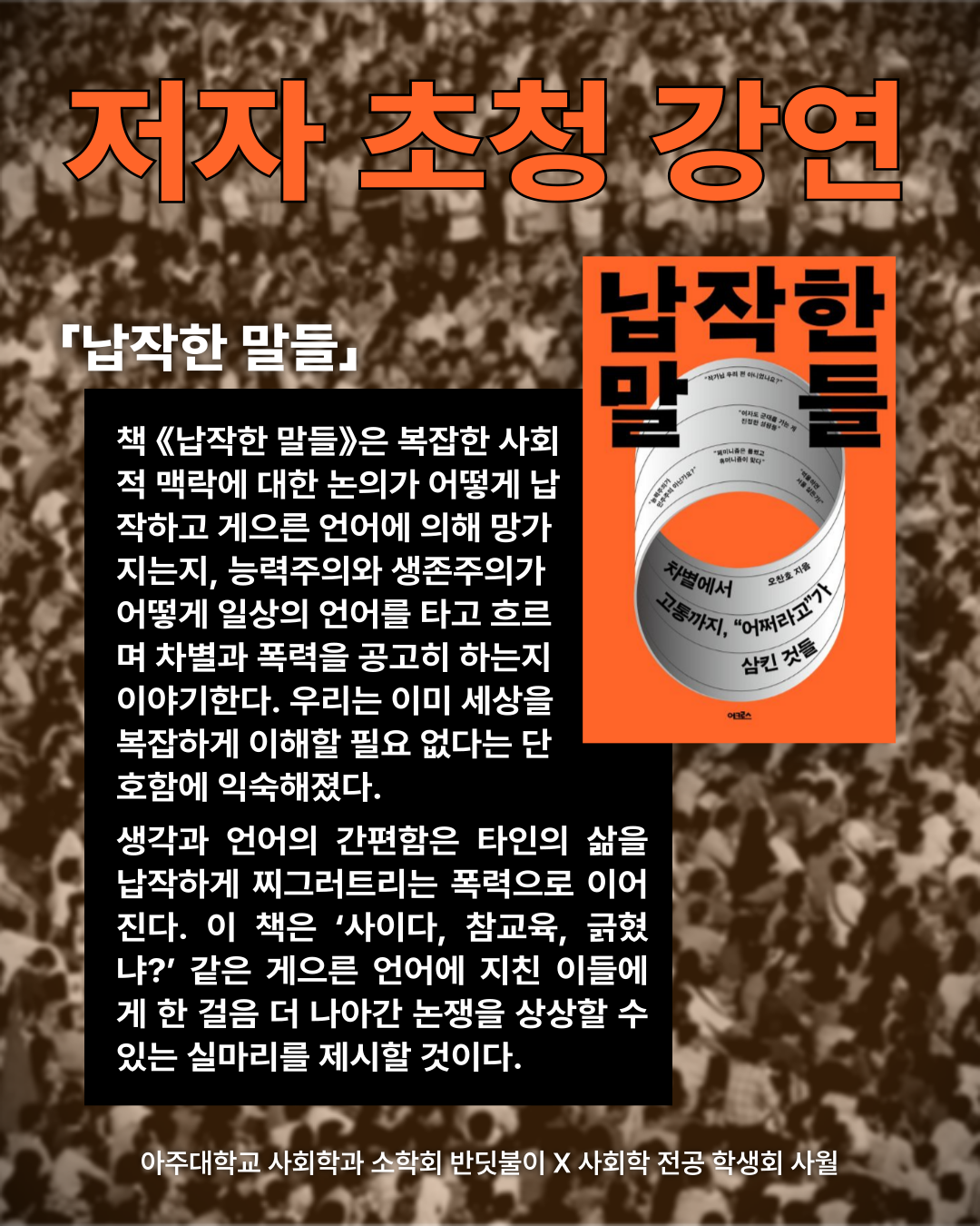 아주대학교 사회학과 소학회 ‘반딧불이’와 사회학 전공 학생회 ‘사월’이 『납작한 말들』의 저자 오찬호 사회학자를 초청하여 강연을 진행합니다.