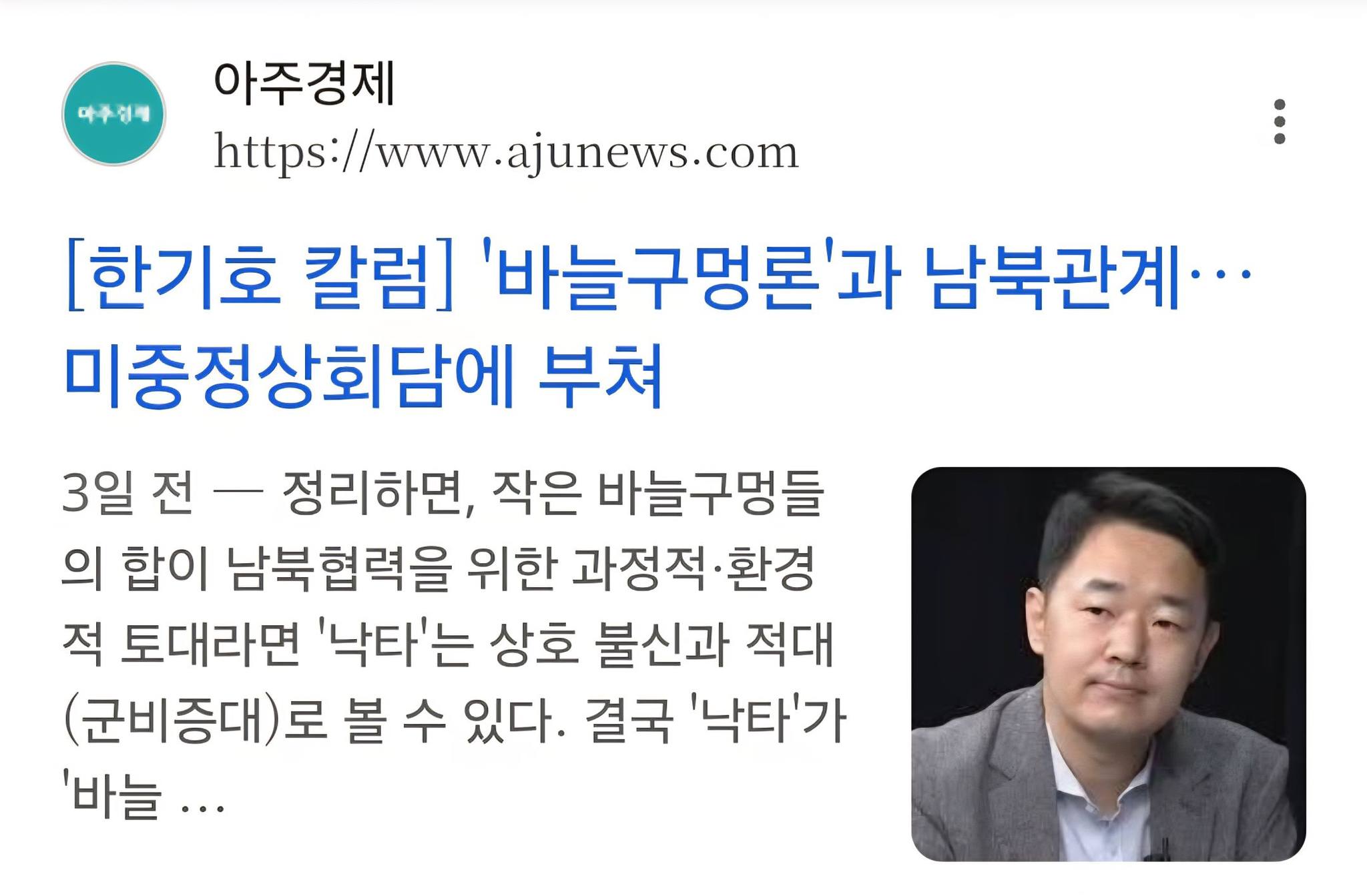 20260228 [교수칼럼] [한기호 칼럼] '바늘구멍론'과 남북관계… 미중정상회담에 부쳐