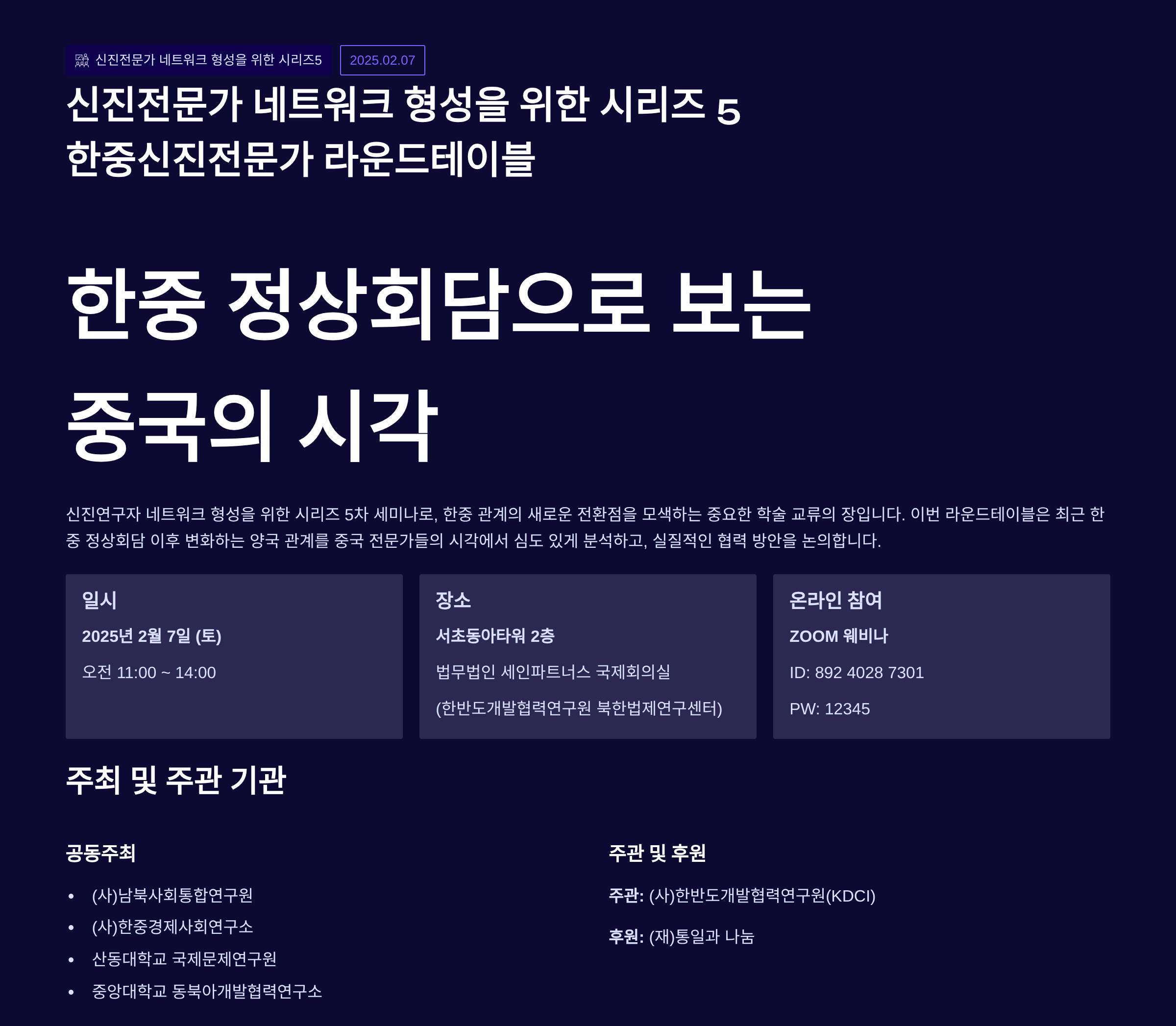 (사)남북사회통합연구원 / (사)한중경제사회연구소 / 중국 산동대 국제문제연구원 / 중앙대 동북아개발협력연구소가 공동 주최하는 이번 행사에 많은 참여와 관심 부탁드립니다.
